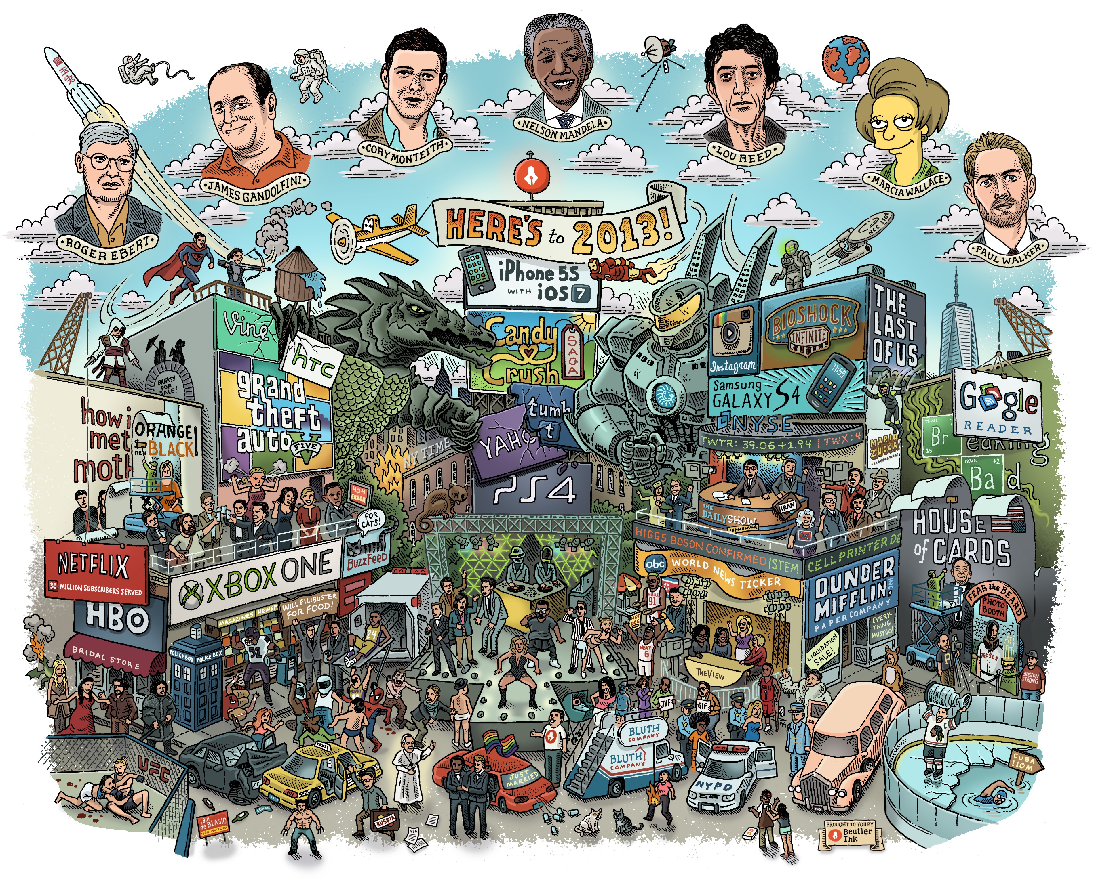 90 korkean profiilin tapahtumaa, New Yorkin Time Squarelle sijoitettuna se tuo mieleen Punaiset häät, Nelson Mandelan kuoleman, Arrested Developmentin paluun, elokuvia, selfieiden tulvan, villin twerkkauksen ja vielä villimmän Miley Cyruksen. Tarjolla oli varmasti paljon vaihtelua. Nyt kohti uutta karusellia tulevana vuonna!