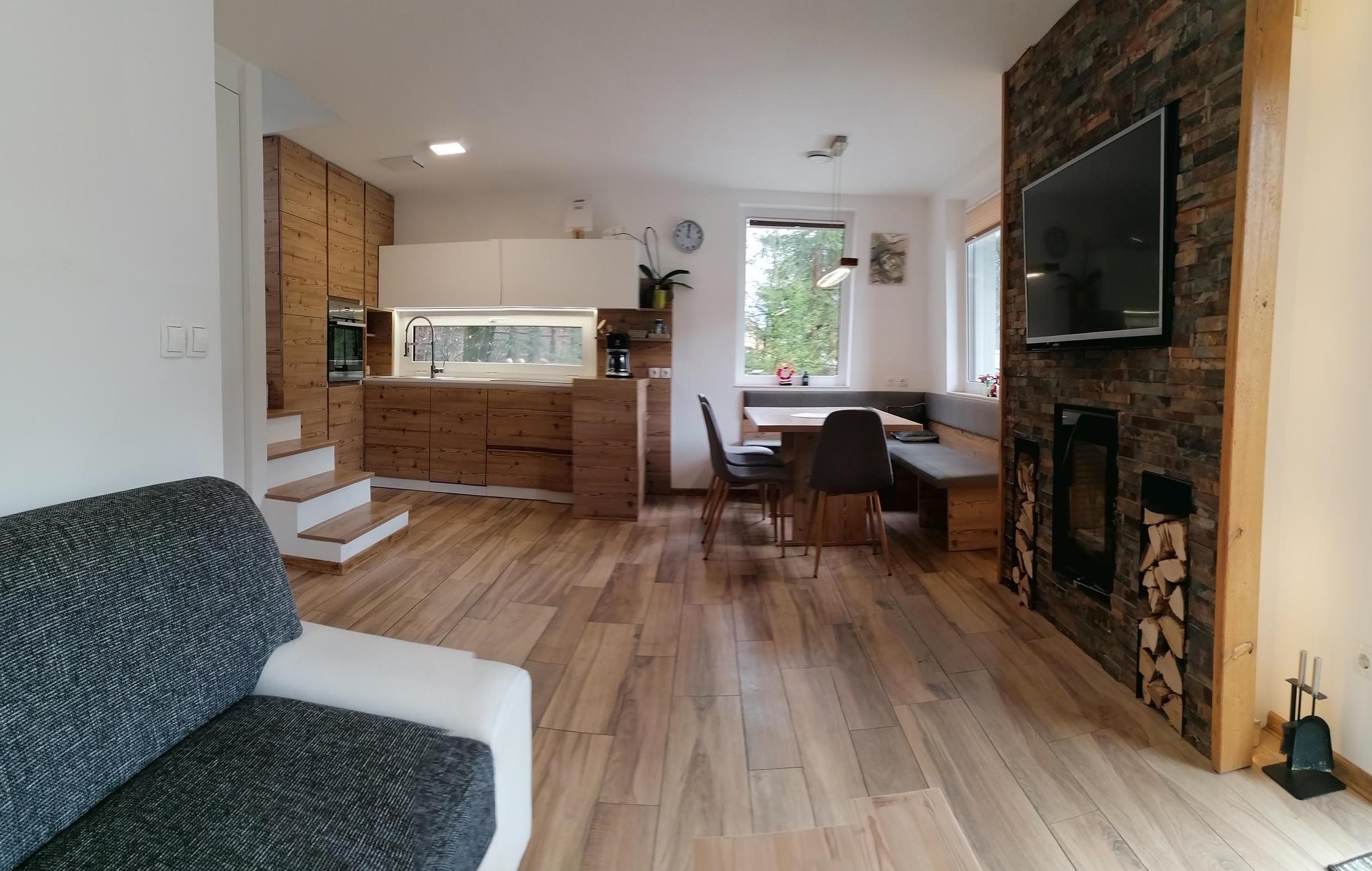 Ob vstopu v hišo Katja se boste najprej znašli v prostorni dnevni sobi, kjer vam je na razpolago udobna sedežna, na kateri boste lahko uživali ob gledanju TV-ja in prasketanju ognja v kaminu. Z dnevno sobo sta povezana sodobno opremljena kuhinja in velik kuhinjski kot. Spalni prostori s tremi ločenimi spalnicami z zakonsko posteljo se nahajajo v prvem nadstropju, kjer je tudi kopalnica.