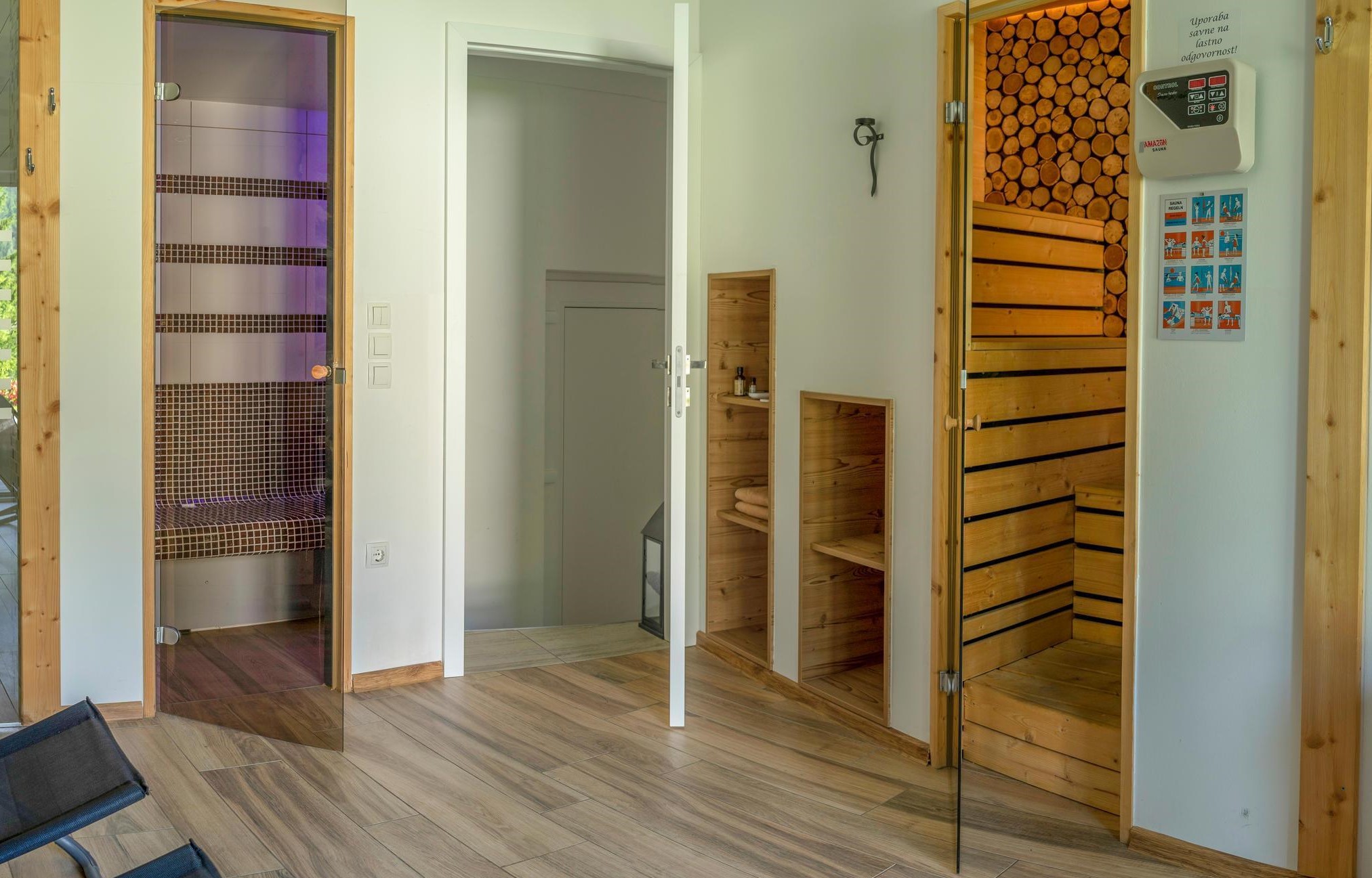 Ob lepem vremenu boste lahko uživali na veliki sončni terasi s prekrasnim razgledom na Špikovo pogorje, ki ga boste lahko občudovali neposredno iz ogrevanega bazena ali iz jacuzzija. Zraven je tudi letna kuhinja, kjer si lahko pripravite hrano na žaru. Sprostite se lahko tudi v zasebnem velnesu, ki vključuje turško in finsko savno.