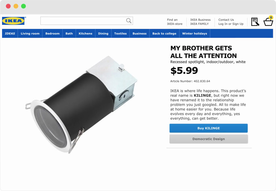 He sanovat, että jokaiseen sairauteen kasvaa ruusu, ja Ikea sanoo, että jokaiseen ihmissuhteen ongelmaan sen tuote "kasvaa". Ikea tunnetaan tuotteistaan mielenkiintoisilla nimillä. Tämä ei ole sattumaa, koska perustaja on lukihäiriö. Siksi hän keksi tuotekoodien sijaan nimeämisjärjestelmän, jotta tuotteet olisi helpompi muistaa. Hän nimesi puutarhakalusteet ruotsalaisten saarten mukaan, antoi tuoleille ja pöydille miesten nimiä, suuremmat tuotteet ruotsalaisten suurten paikkojen mukaan... Nyt Ikea kääntyi Googlen puoleen ja nimesi tuotteet parisuhdeongelmien haetuimpien termien mukaan. Jokainen tuote ratkaisee ongelman, jota varten se on nimetty.