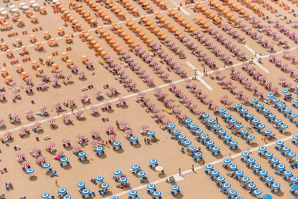 saksalainen valokuvaaja Bernhard Lang hän asuu ja työskentelee Münchenissä, ja hänen "erikoisalansa" on ilmakuvaus. Tähän asti hän kuvasi pääasiassa Saksan maisemaa ilmasta: kaivoksia, siirtokuntia ja Saksan teollisuusosia. Mutta hän vieraili vuosia sitten lomakohde Adria Italiassa. Siellä hän teki vaikutuksen värikkäiden sateenvarjojen sijoittelusta rannoille, jotka ovat kaikkialla suorissa riveissä. Kohtaus ei selvästikään antanut hänelle rauhaa, koska hän palasi tänä vuonna - paitsi lentokoneella, josta hän vietti useita tunteja valokuvaamassa Riminin ja Ravenan kaupunkien välistä rannikkoa.