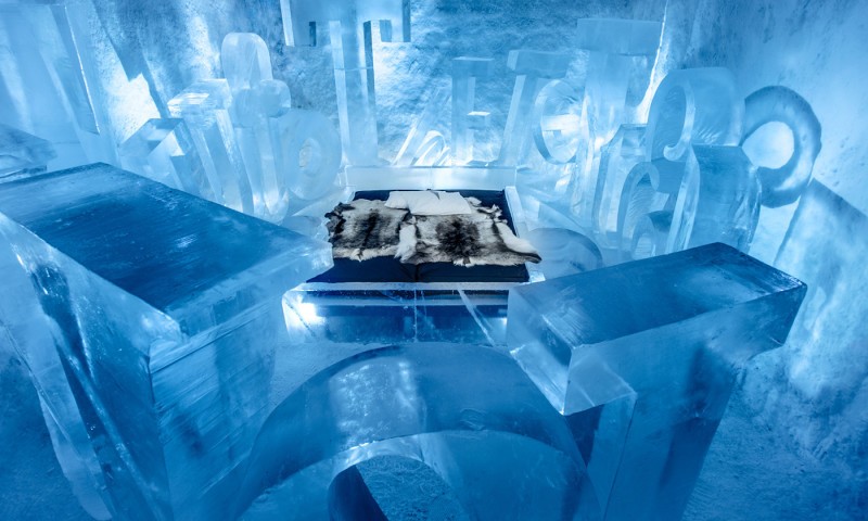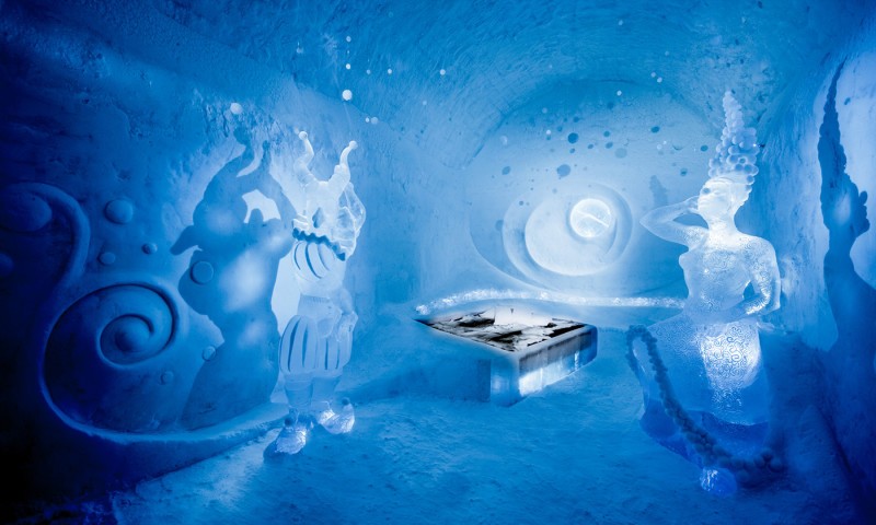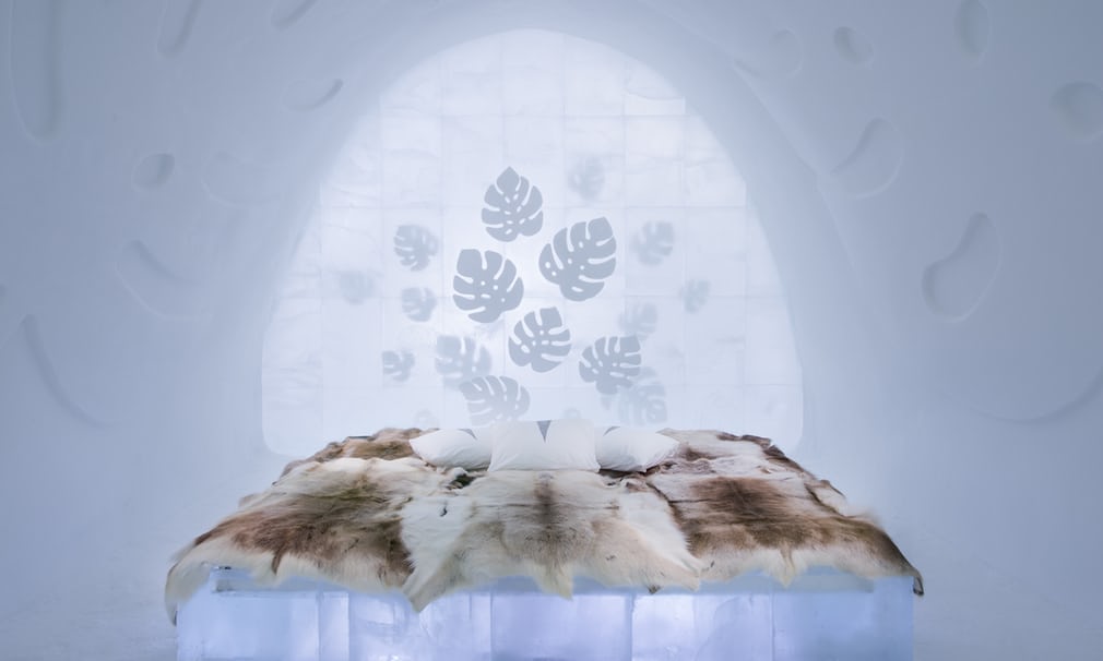 Hotellissa he jääasunnot, jotka tänä vuonna on koristeltu jääveistoksilla sademetsä, vuorigorillat, pohjoiset kuningattaret ja pilviä.