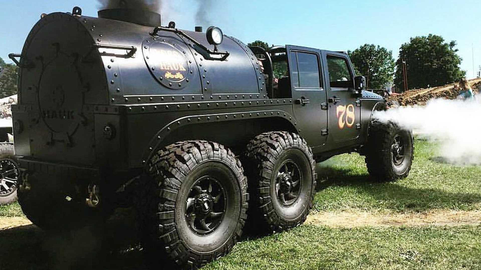 Seveda gre v tem primeru za vettä, vastaavasti vesipitoinen paro. Jeep Wrangler, z vzdevkom Loco Hauk, prihaja iz Chambersburga, iz zvezne države Pensilvanija. Tam boste našli podjetje Hauk Designs, ki se ukvarja s predelavo avtomobilov, večinoma terenskih.