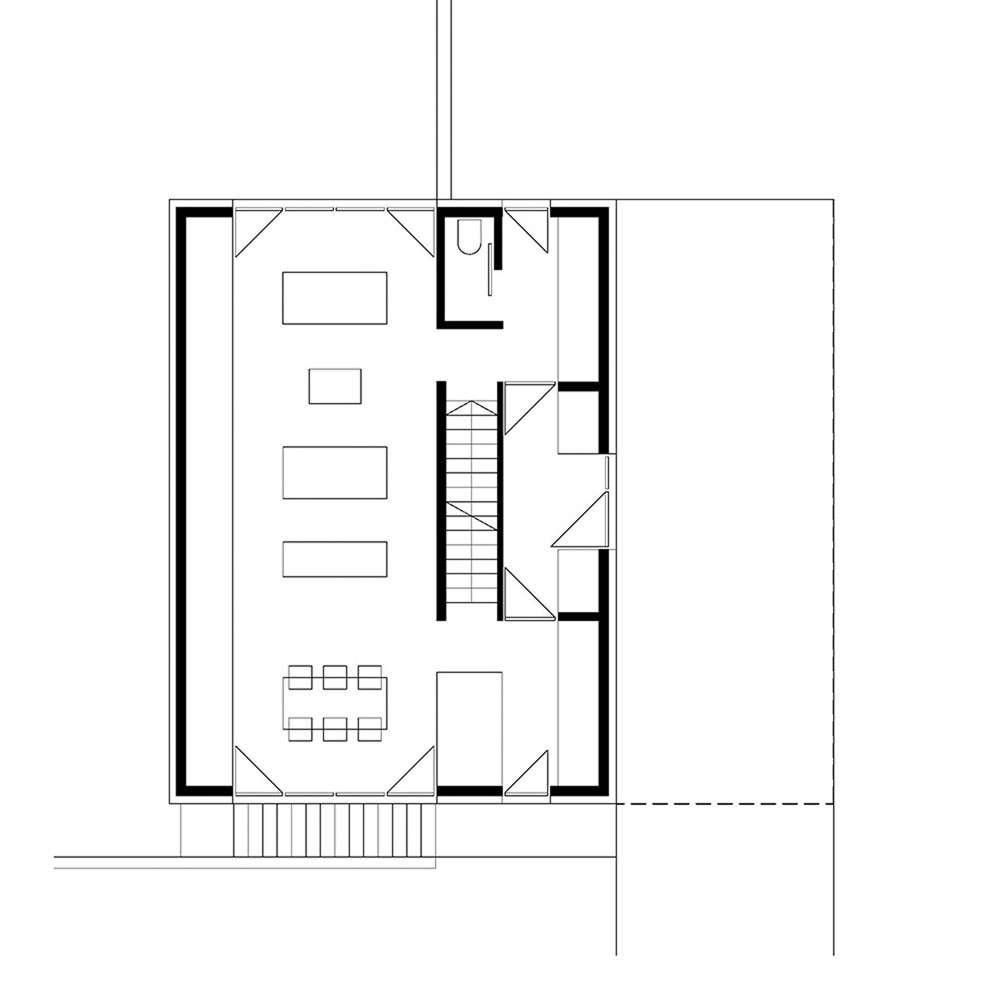 Največji omejitvi pri snovanju zgradbe sta bili nagnjen teren in gosta okoliška zazidava. Arhitekti so tako želeli čim večji del gradbene parcele pustiti prazen. S pomočjo dveh konzolnih volumnov so uspeli tloris stavbe minimalizirati na samo 33 kvadratnih metrov, sicer pa ima stavba 180 kvadratnih metrov bivalne površine. Zgradba deluje kot da se zgolj lahkotno dotika terena, konzoli pa ustvarjata pokriti zunanji površini – eno v kletnem nivoju, ki se odpira proti naravi ter eno na nivoju ulice, ki služi kot nadstrešek nad parkiriščem ter vhodom.