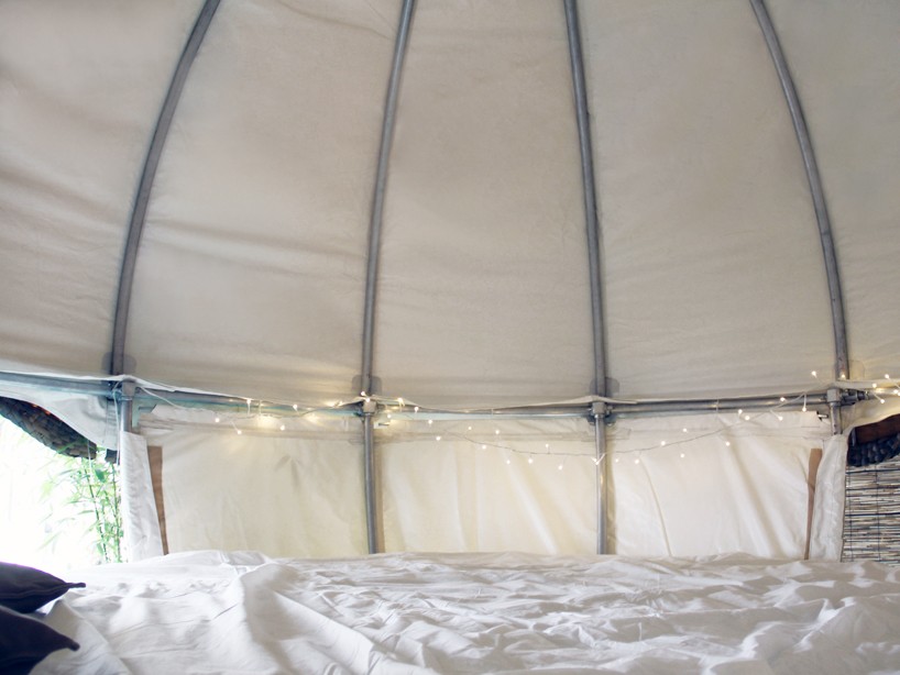 Kehys koostuu 12 pitkästä tangosta yläosassa ja samasta määrästä lyhyempiä tankoja alaosassa. Kookonpuu köysien ja verkon avulla maanpinnan yläpuolella, jotka estävät bivouakin liikkumisen mihinkään suuntaan. Kantavuus Cocoon Tree on melkoinen 2,3 tonnia. He asettivat sen sisään pyöreä sänky, jonka halkaisija on 2,4 metriä, mikä riittää pariskunta kahden pienen lapsen kanssa.