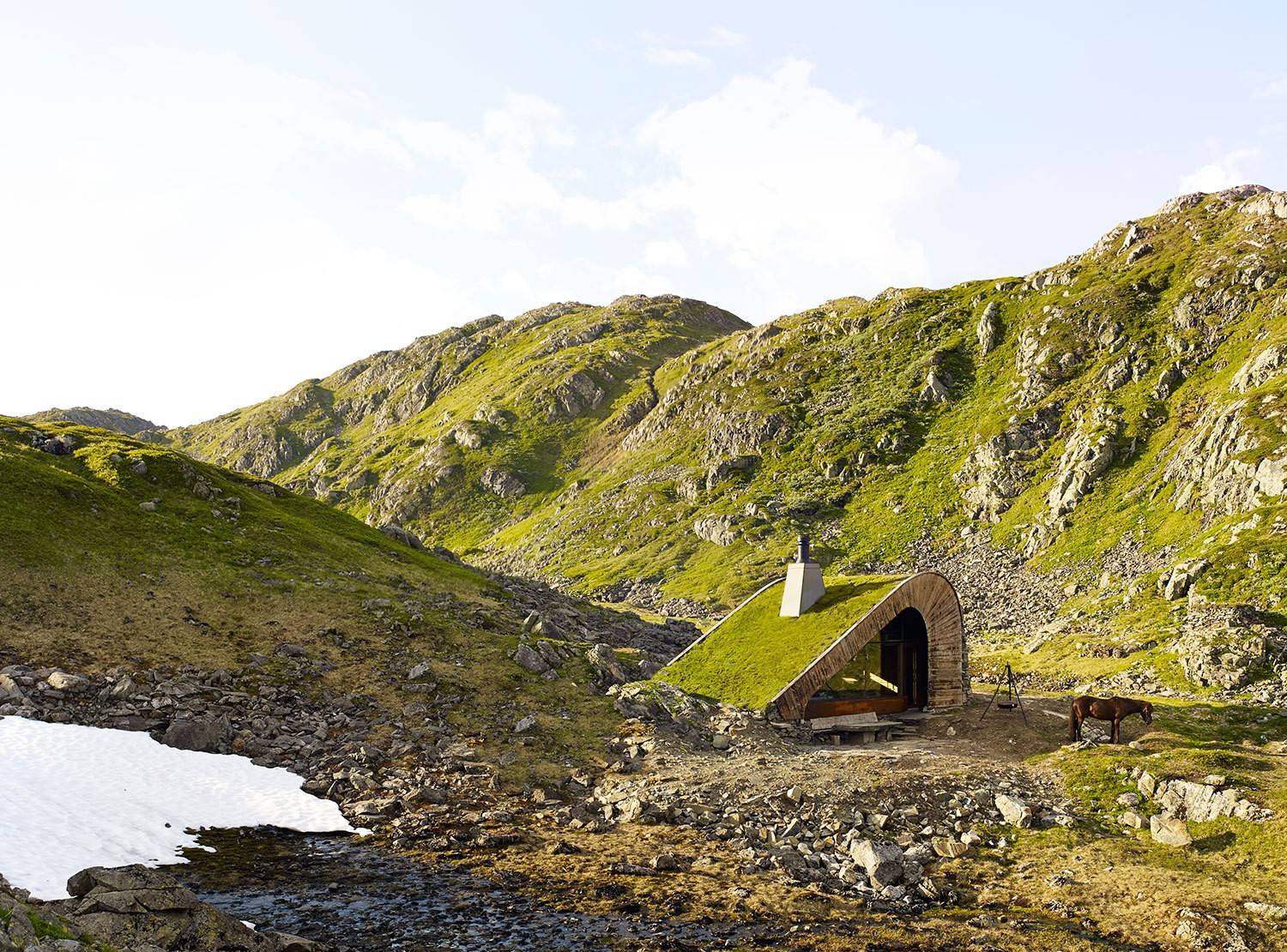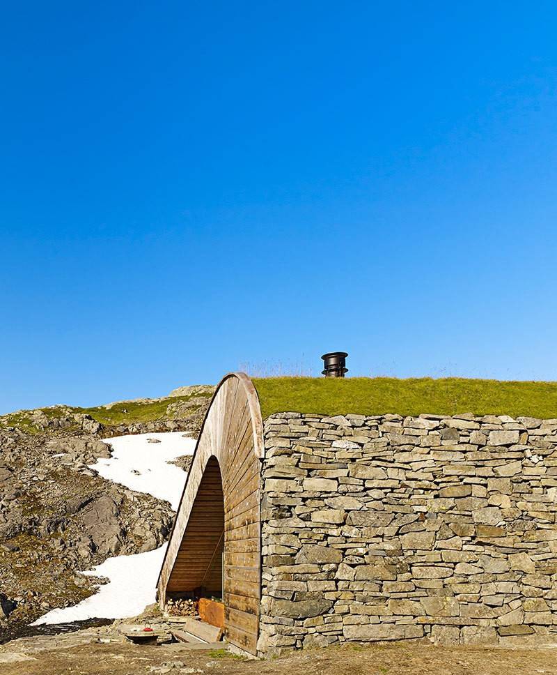 Lovska koča Akrafjorden je delo arhitekturnega biroja Snøhetta ja on dostopna zgolj za pešce in konje. Zavoljo zvite zasnove hiše (iz jeklenih nosilcev), ki jo prerašča mah in obdajata lokalni les in kamen, se praktično zlije z idilično okolico z jezerom na pragu in visokimi gorami za ozadje, kljub majhnosti pa nudi zatočišče kar 21 gostom.