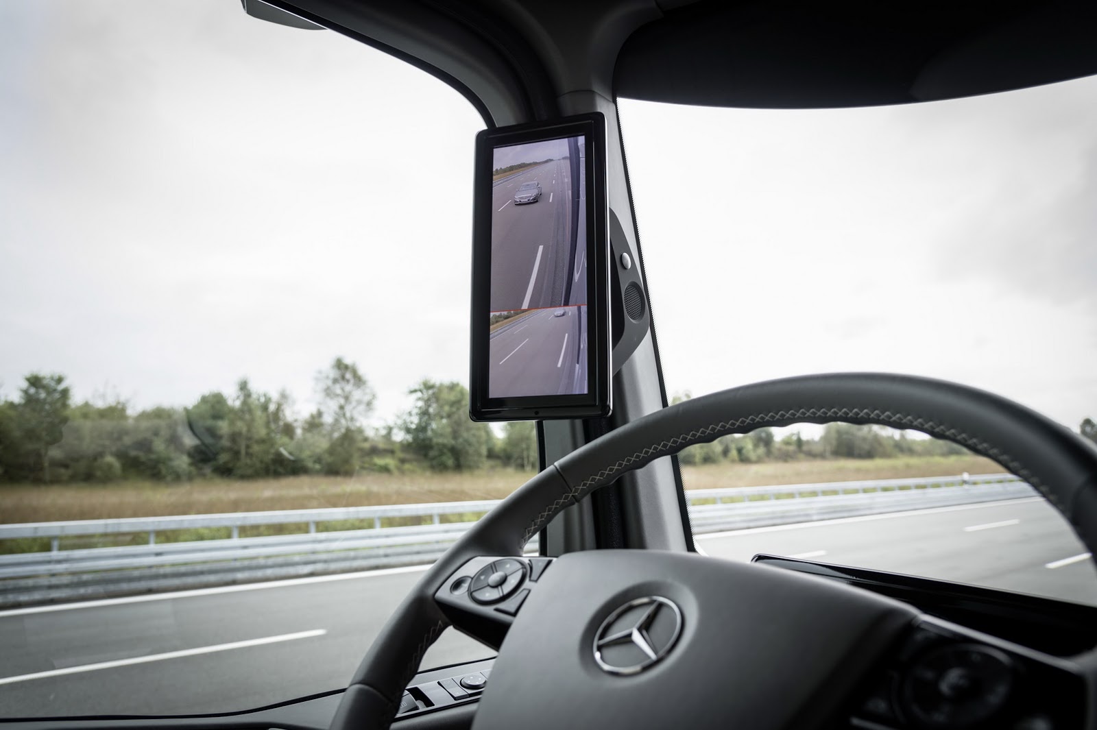 Poleg tega ima sistem, ki zaznava vozila v mrtvem kotu in na to tudi opozori voznika, če obstaja možnost nesreče, pa tovornjak tudi samodejno zavre in se lahko tudi popolnoma zaustavi.