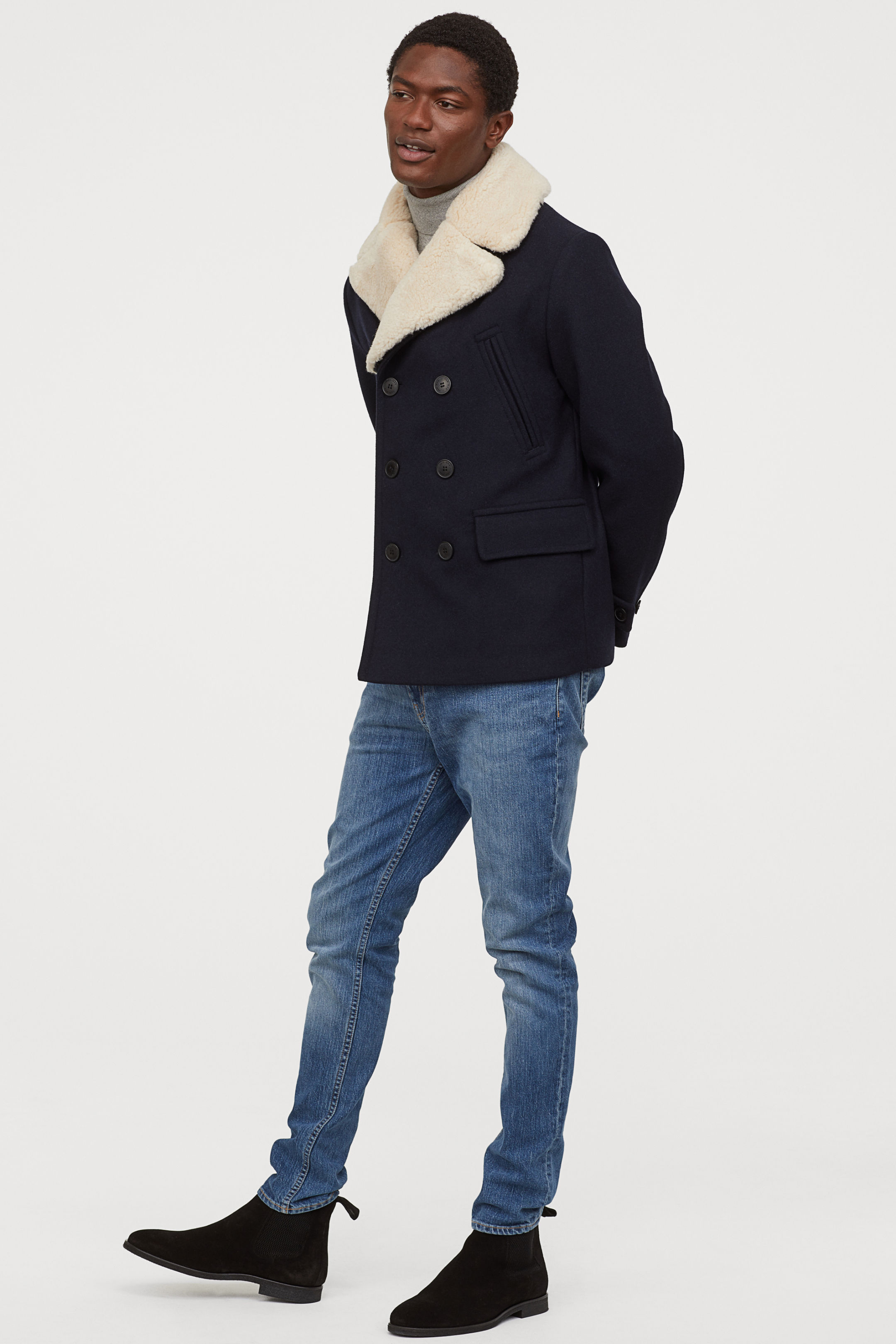 Če prisegate na pristno klasiko, brez odštekanih vzorcev ja barv, lahko potem zavijete v mornarske vode in si privoščite krajši plašč na dvojno zapenjanje, ki se mu reče tudi mornarski plašč.