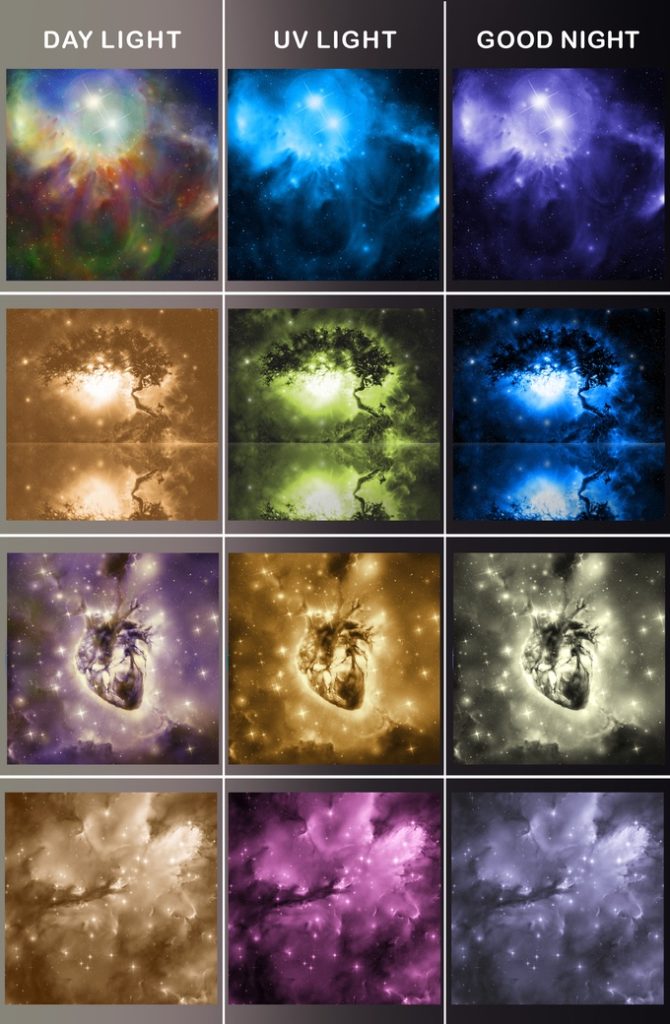Multiluminous ovat pimeässä hehkuvia tapetteja ja seinäprinttejä, jotka näyttävät erilaisilta erilaisissa valaistusolosuhteissa. Niiden avulla voit muuttaa huoneen taianomaiseksi maaksi tai loihtia tähtitaivaan neljän seinän taakse.