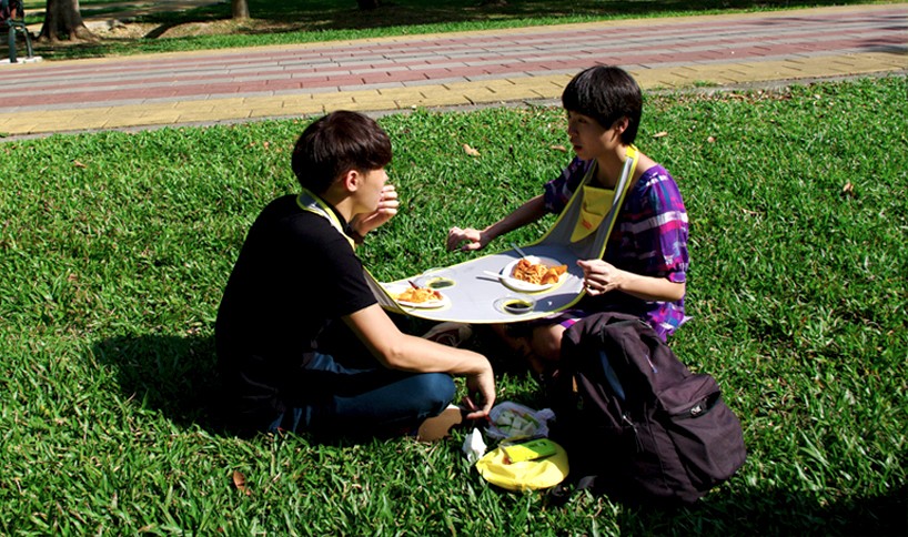 Aikoinaan pöydässä syöminen oli sosiaalinen tapahtuma. Syömisen lomassa kuului iloista rupattelua. Nykyään kaikki tuijottavat näyttöään, ottavat kuvia ruoastaan ja jättävät läsnäolijat huomiotta. Jotta voisimme keskittyä toisiimme syödessämme, teollinen muotoilija Hung Lu Chan loi puettavan lautasliinapöydän.