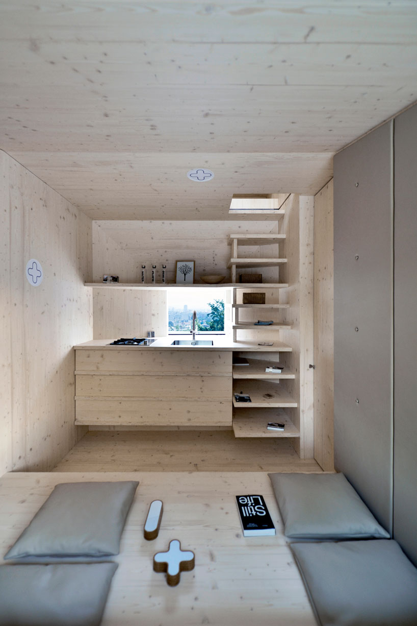 Laitos, joka luotiin yhteistyössä italialaisen C+C-yrityksen, C28:n ja slovenialaisen puusepänyrityksen Permizin kanssa, on valmistettu kokonaan slovenialaisesta kuusestaPerusajatuksena oli, että moduulit mahdollistaisivat erilaisia väliaikaisia käyttötarkoituksia, matkailupalvelut to pysyäPerusmalli koostuu yhdestä moduulin koko 4,50 m x 2,50 m, korkeudet 2,70 m, mikä riittää kaksi henkilöäNe ovat sisällä. keittiö, kylpyhuone, sänky ja istuimetVoit pinota sen vaakasuoraan tai pystysuoraan. Linnan kirjasto on järjestetty pystysuoraan, joten jokaisessa kerroksessa on kirjoja eri aiheista, ja Plečnikille ja arkkitehtuurille on löydetty erityinen paikka kirjanurkkauksessa. Jos haluat lukea samalla kun ihailet Ljubljanan maisemia, ulkona on myös laskeutumispaikkoja.