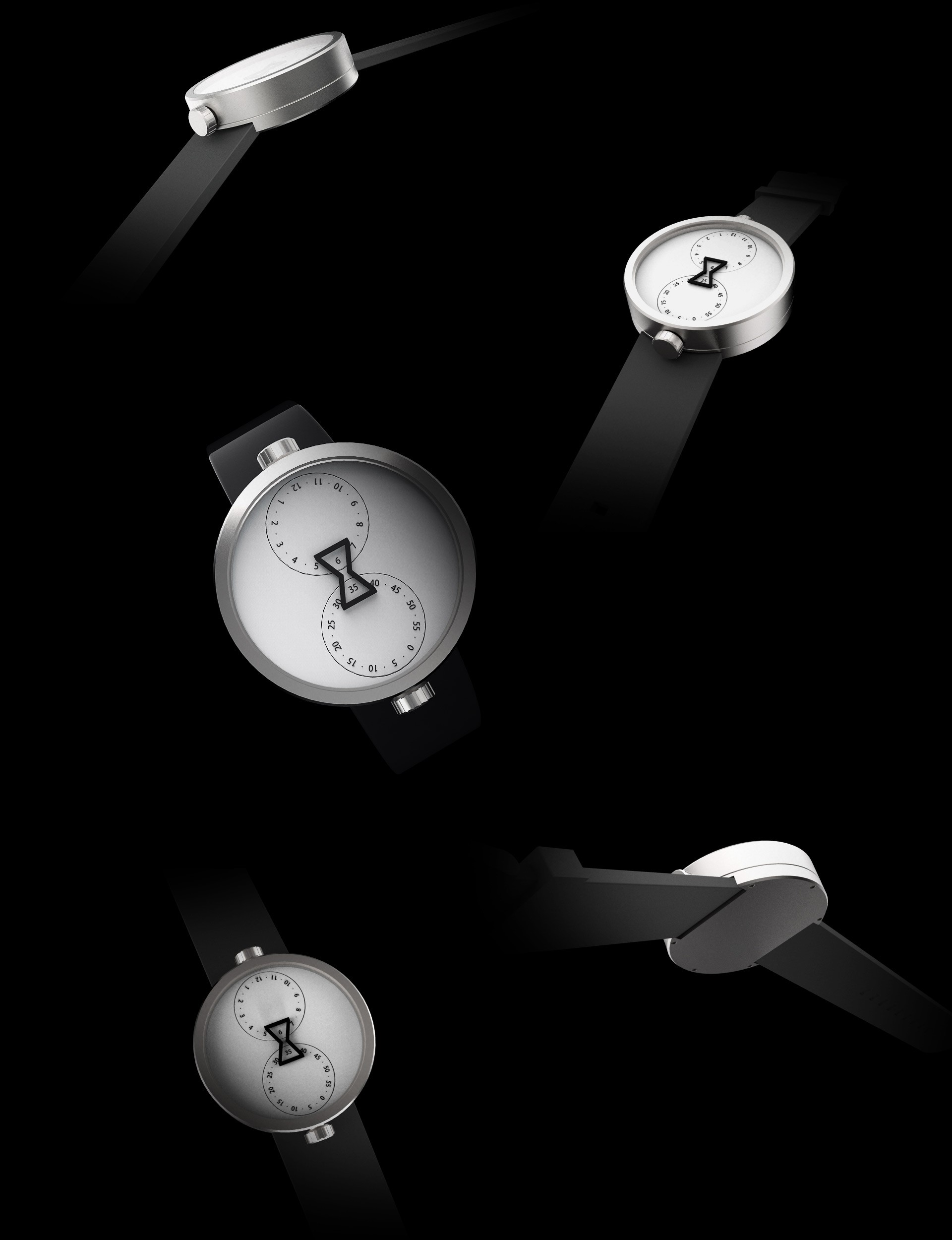 Minimalistinen rannekello PPE-valvonta voi ylpeillä millä kaksi kellotaulua, jotka yhdessä näyttävät tarkan ajan. Ylempi laskee tunteja, alempi minuutteja. Viisarien sijaan, joita siinä ei ole ollenkaan, kellotaulut pyörivät ja kellonaika on kehystetty. tiimalasin siluetissa keskellä PPE-kelloa.
