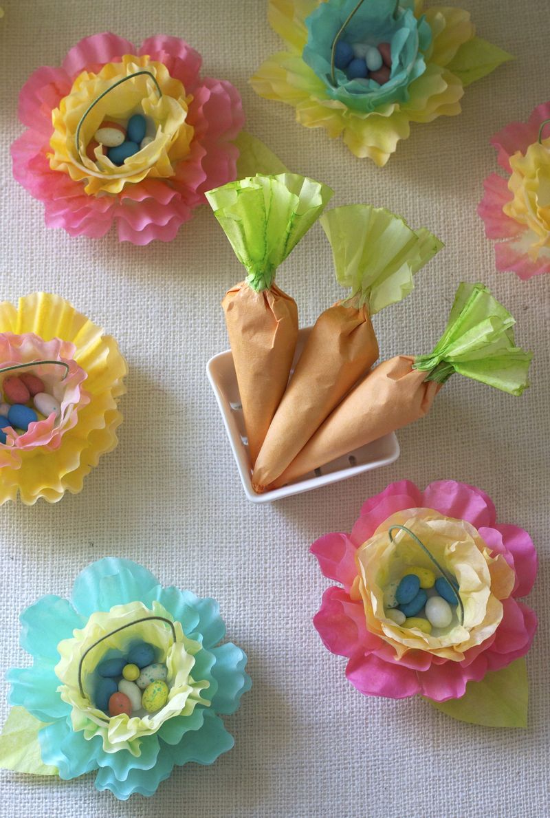 2. Kun ostat munia, säästää pahvia, koska voit hyödyntää sitä koristeena ja kontti, jossa palvelet pirheä. Leikkaa pahvi niin, että saat neljän kupit. Maalaa pahvi ja yhdistä useita leikattuja kuppeja seppele. Täytä seppele koruilla, kukilla, makeisilla.