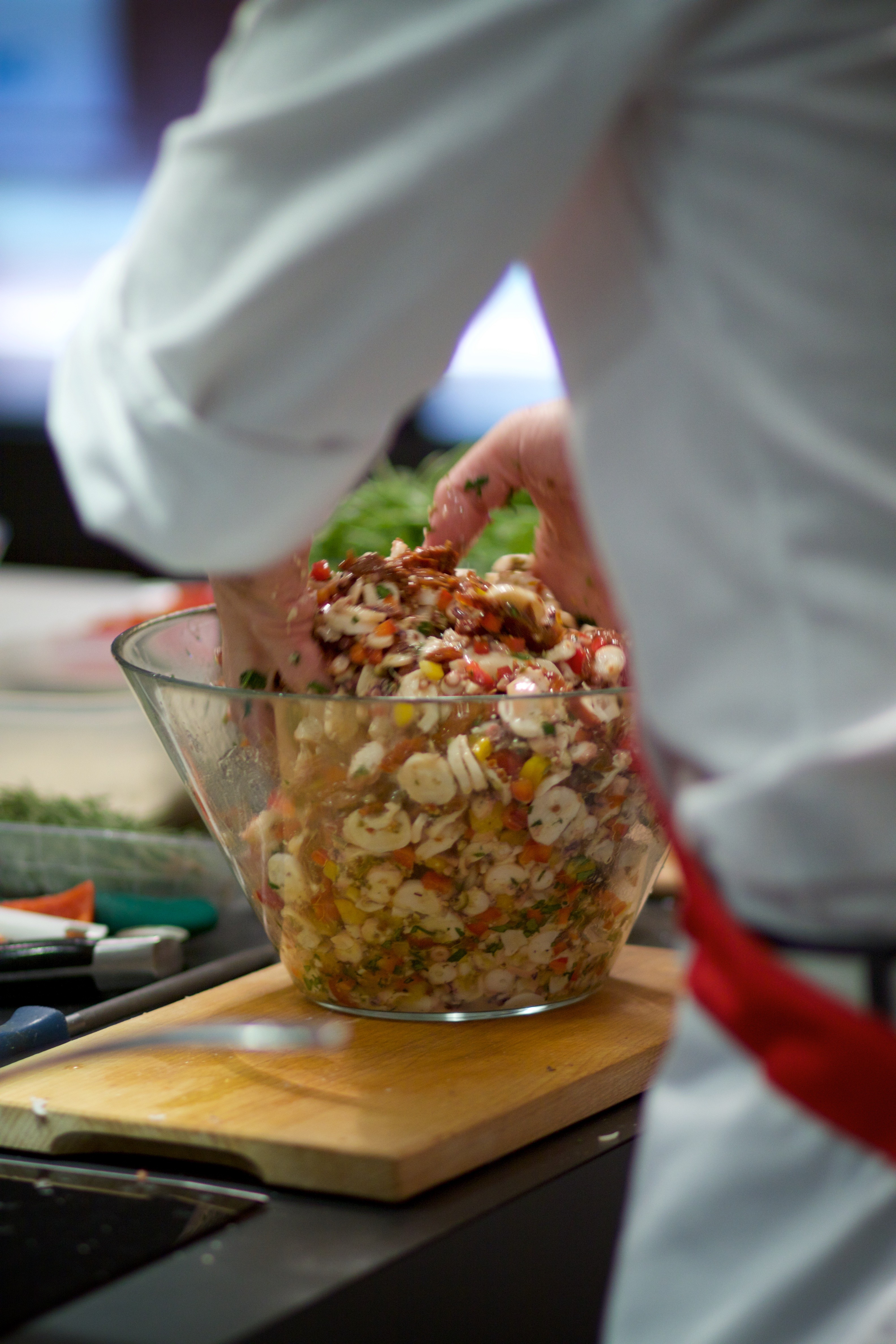 Taitavasti ja huumorilla hän johti meitä ja otti meidät mukaan valmisteluun mustekala salaatissa, kastanja gnocchia katkarapujen kanssa ja kalaa, uuniperunat ja naudan pihvi ja jälkiruoat vuohenjuustolla, mikä viimeisteli mukavasti kolmen tunnin seurustelun lieden äärellä. Ruoalla myös makuhermojamme hemmotellaan erilaista viiniä ja tapahtuman virallinen vesi Pit.