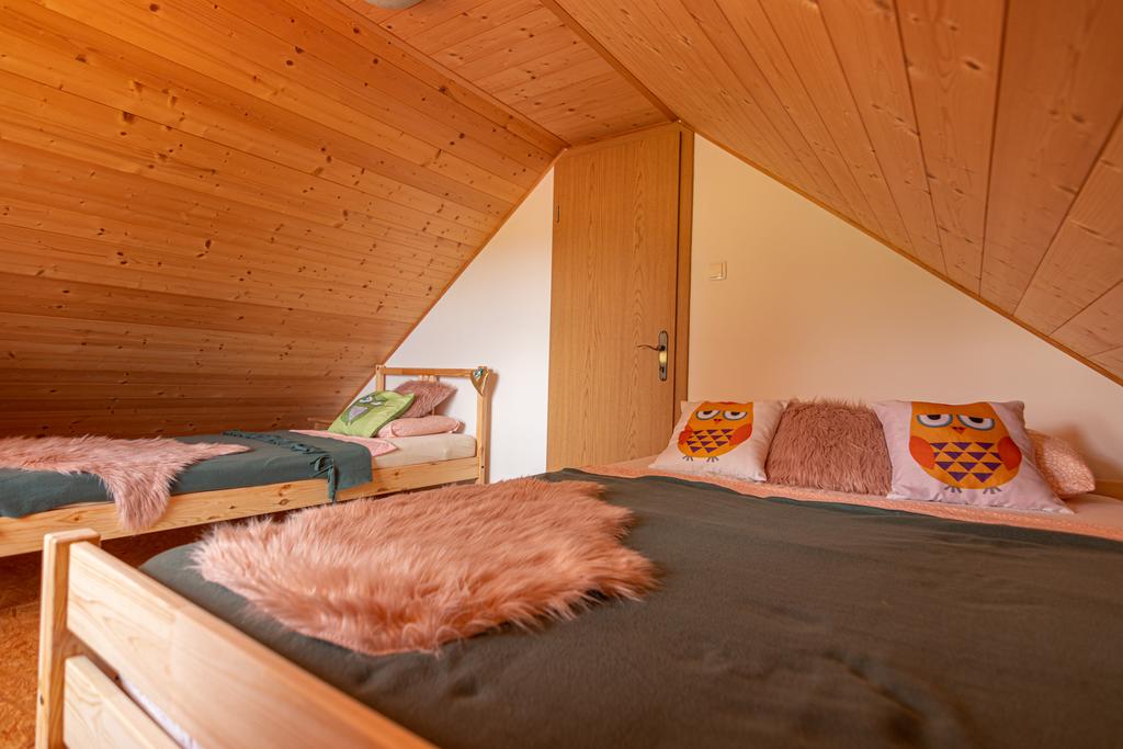V zgornjem nadstropju sta dve udobni spalnici. V svetli in sodobni kopalnici najdete stranišče, umivalnik, kombinirani tuš in kad, pričakala pa vas bo tudi sveža posteljnina in brisače, skupaj z brezplačnim milom in šamponom. Spodnji, dnevni prostor nudi udoben kavč ja v celoti opremljeno kuhinjo. Namestitev vključuje tudi brezžični internet, klimatsko napravo, ogrevanje, sušilec za lase ja brezplačno parkiranje. Tudi najmlajši gostje so dobrodošli – previjalna mizica ter otroški stolček sta vam na voljo ves čas.