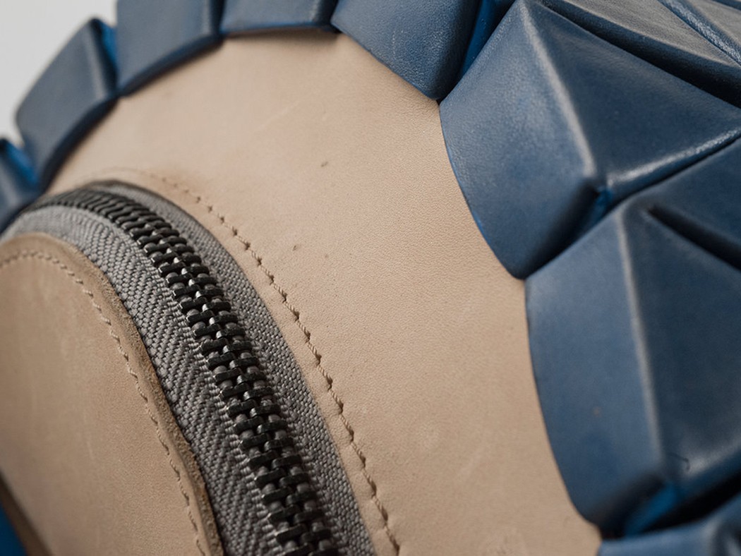Geometrijska trikotna struktura satovja je iz naravnega govejega usnja in temelji na študiji razširljivih struktur. Notranja lupina je iz blaga z lycro, ki zunanji lupini dodaja elastičnost in prilagodljivost tudi po telesu uporabnika. Preostali del “vreče” nahrbtnika pa je obdan z usnjem.