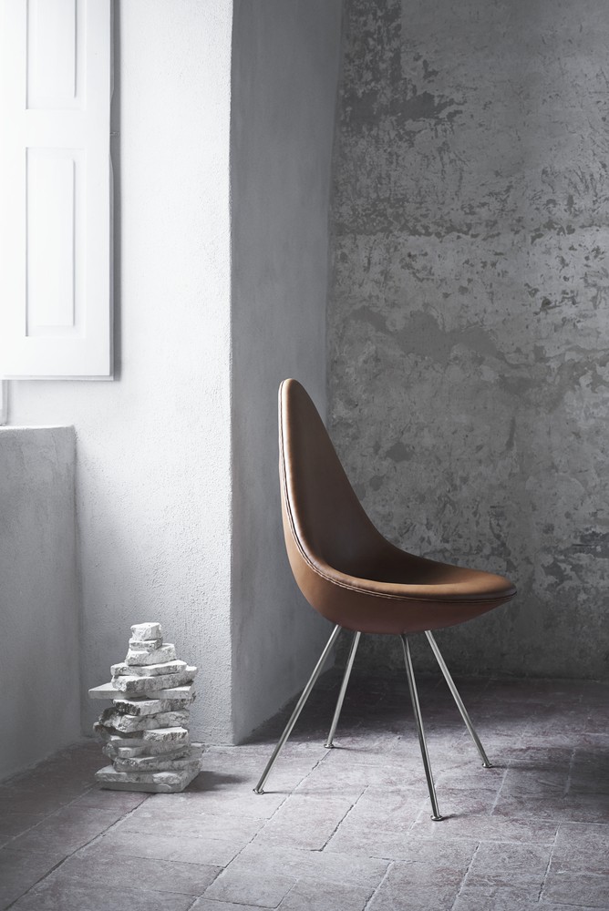 Po tem, ko je podjetje Republic of Fritz Hansen aprila letos na milanskem pohištvenem sejmu oznanilo, da bodo obudili produkcijo klasičnega stola Drop je le-ta pred kratkim končno prispel na trg. Stol je danvega leta 1958 zasnoval Arne Jacobsen, eden vidnejših arhitektov modernistične dobe. V osnovi so bili stoli Drop, Swan in Egg narejeni v omejeni izdaji ekskluzivno za opremo Radisson Scandinavian System Hotela v Kopenhagnu, Stola Swan in Egg sta kmalu šla v množično proizvodnjo in postala kultna oblikvalska kosa, elegantnen Drop pa je do danes utonil v pozabo.