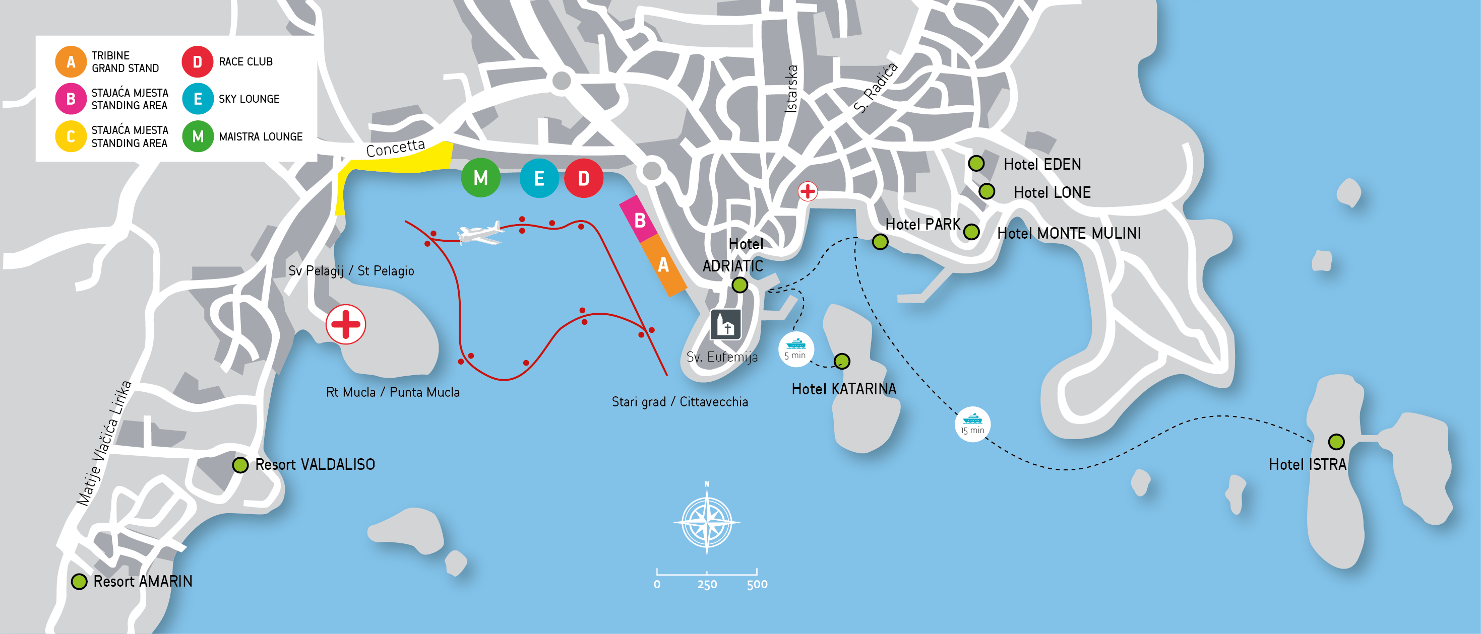 Nyt pääsemme myös nauttimaan ottelun katselusta, sillä koneet lentävät meren yli meidän välittömässä läheisyydessämme, ihanassa merenrantakaupungissa Rovinj Kroatiassa, mikä näyttää olevan erittäin mielenkiintoisia tapahtumia (viime vuodesta myös Tuntematon festivaali) houkuttelee yhä enemmän turisteja. Haastava kilparata tuulee kaupungin pohjoisrannalta lähellä vanhaa kaupunkia ja tekee jyrkän ja tiukan käännöksen lahden yli kalatorin, esikaupunkien rantojen ja sairaalan ohi, joten lentäjät selviävät sarjan käännöksistä ja korkeista lentokonekuormista. . Lisämaksusta haaste ja adrenaliini sääolosuhteet pitävät huolta myös verestä, kuten Adrianmeren rannikolle tyypillistä myrsky, joka voi vaikuttaa merkittävästi aiheen kulkuun ja lopputulokseen.
