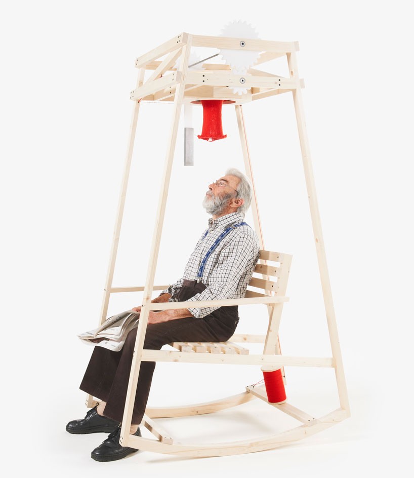 Keinutuoli Rocking-Knit se on keinutuoli, ki nam med guganjem splete kapo. Kvačkanje v slogu babice nad glavo poteka s pomočjo kinetične energije, ki se ustvarja z zibanjem, to pa s pridom koristi poseben mehanizma, ki počasi, a vztrajno plete zimsko pokrivalo iz volne.