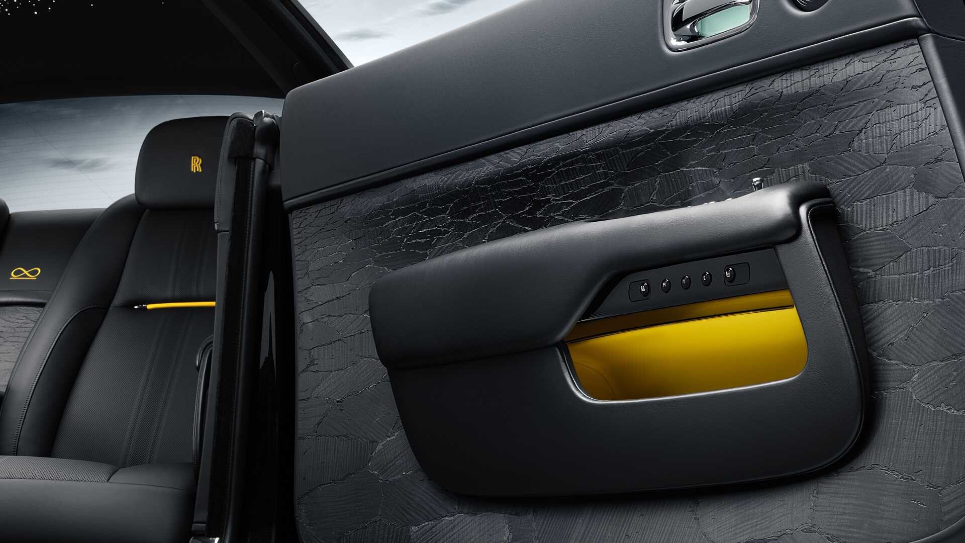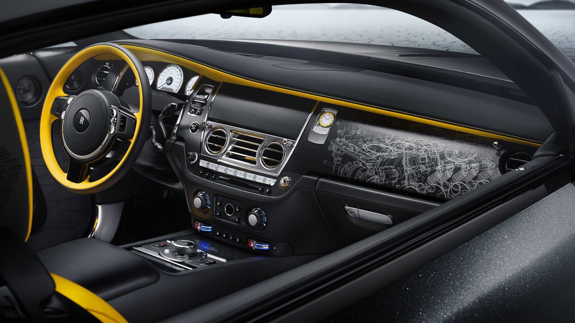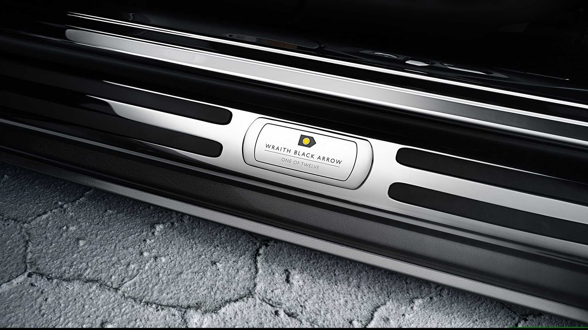 Rolls-Royce Black Badge Wraith Black Arrow siinä on kaltevuusvärinen ulkopinta, joka vaihtelee etuosan hopeasta mustaan takana, ja kaikkialla on keltaisia aksentteja. Celebration Silver- ja Black Diamond -väreissä on lasinen pintamaali, joka lisää visuaalista vaikutusta. Värit ja levitystekniikat olivat täydellisiä 18 kuukautta, mikä tekee siitä yhden Rolls-Roycen koskaan luomista monimutkaisimmista väreistä.