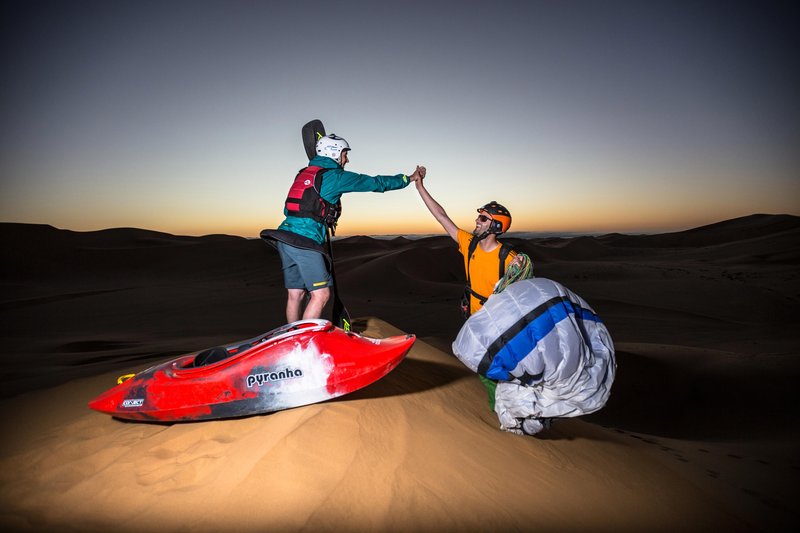kyllä sinä voit na peščenih sipinah smučamo in bordamo kot na belih strminah verjetno že veste, gotovo pa ne veste, da se lahko po njih spuščamo tudi s kajakom in izvajamo manevre vredne spusta po deroči reki. To je dokazal izkušeni kajakaš Eric Walker, ki se je preganjal po peščenih sipinah afriške puščave Namib, ki se razteza na dva tisoč kilometrih vzdolž atlantske obale.
