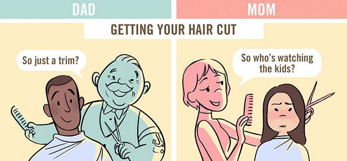 Chaunie Brusie on luonut sarjan sarjakuvia, jotka kuvaavat kuinka arvostelemme äitejä ja isiä eri tavalla julkisesti. Moni asia annetaan anteeksi jälkimmäiselle, koska se on "historiallisesti". lasten kasvatus se ei ole heidän päätehtävänsä. Siksi me sulamme isän, jolla on pieni lapsi, nähdessämme, kun taas äitien kanssa vain etsimme jotain, mistä häntä syyttää. vastuutonta vanhemmuutta.
