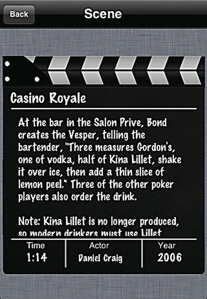 Mitä helvettiä tämä taas on?! Se liittyy ehdottomasti jotenkin Hänen Majesteettinsa agenttiin 007, sitä ei ole vaikea selvittää. Ja älkäämme innostuko liikaa suuren paljastuksen kanssa – se on todellinen pieni tietosanakirja sovelluksen muodossa, joka paljastaa KAIKKI Bond-juomat kaikista James Bond -elokuvista. No, sekä reseptit ja yksityiskohtaiset ohjeet niiden valmistukseen ja tarjoiluun: »Vodka Martini. Ravistettu, ei sekoitettu.” ja kaikki muut juomat, joita 007 nautti elokuvissa. Sovellus sisältää Bond-elokuvan kokonaisuudessaan, ”baaripäiväkirjan”, johon kirjataan jokainen juoma aikaleiman ja kuvauksen elokuvakohtauksesta, jossa se nautittiin. Ja varoitus: sovellus on saatavilla yli 17-vuotiaille. Kippis sitten!