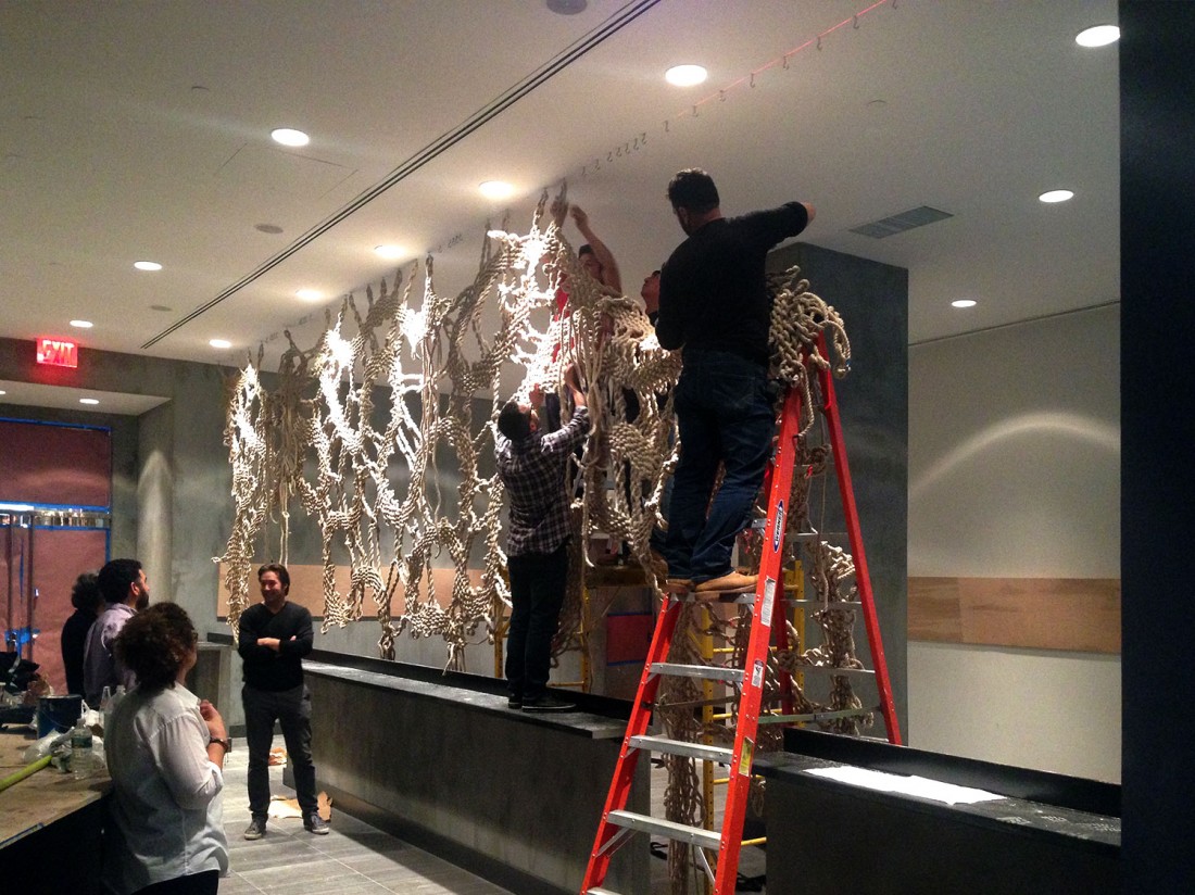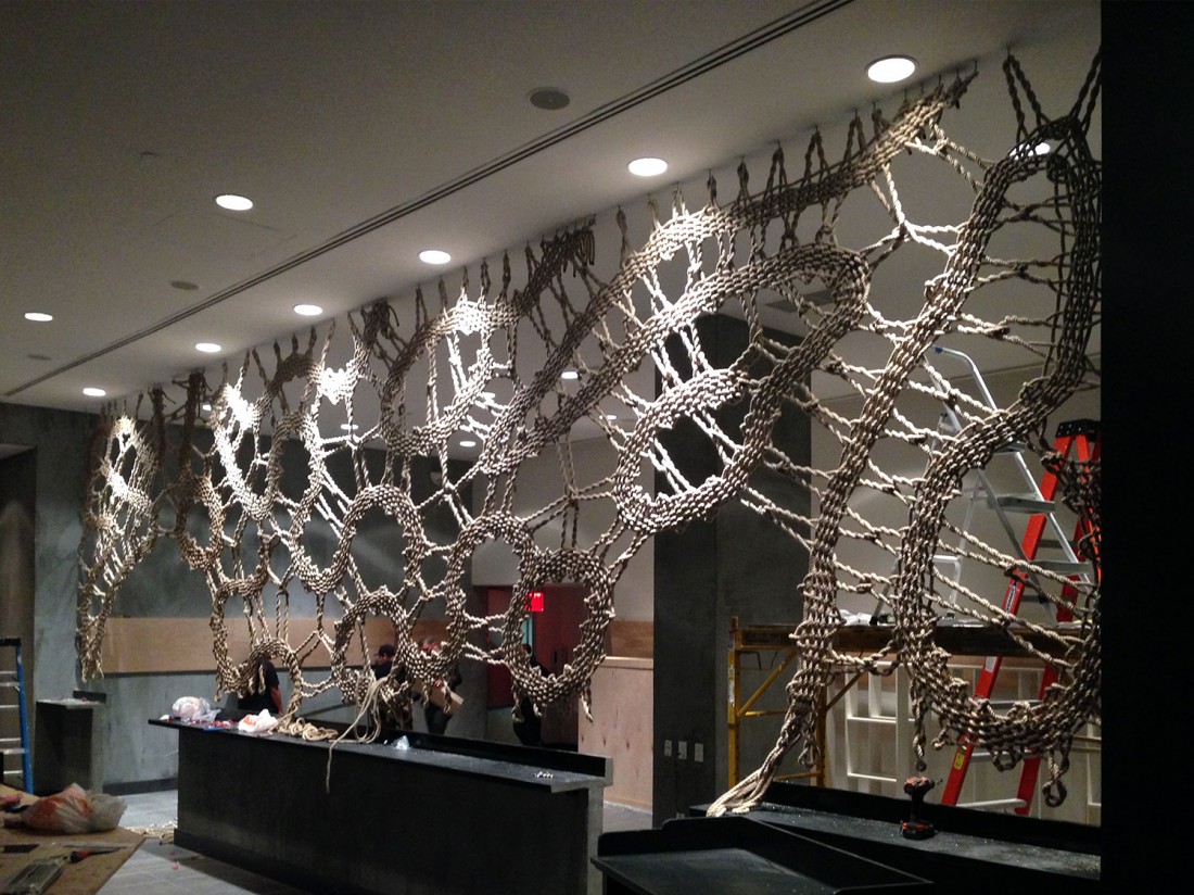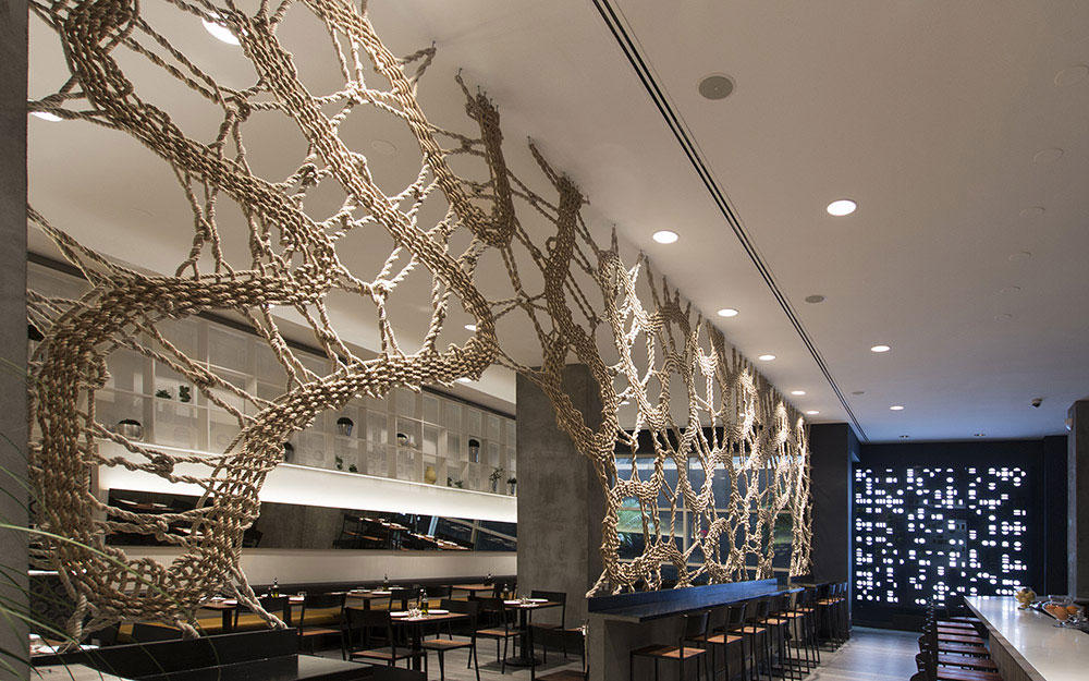 V New Yorku se je nedavno odprla nova mediteranska restavracija, katere sredozemsko atmosfero poudarja ravno zaslon iz idrijske čipke. Velikansko verzijo tradicionalne ročne obrti je zasnovala Manca Ahlin, arhitekta in oblikovalka slovenskih korenin, ki je tudi za izvedbo poskrbela sama. Čipka služi kot zaslon, ki ločuje jedilnico od bara, zanimiva pa je predvsem zaradi svoje velikosti. Namesto iz nežne svilene niti je namreč spletena iz močne mornarske vrvi in na stene pritrjena s sto petdesetimi jeklenimi nosilci. Pod oblikovanje interierja restavracije so se sicer podpisali arhitekti Archipelagos v sodelovanju s studiem A2 Interiors.