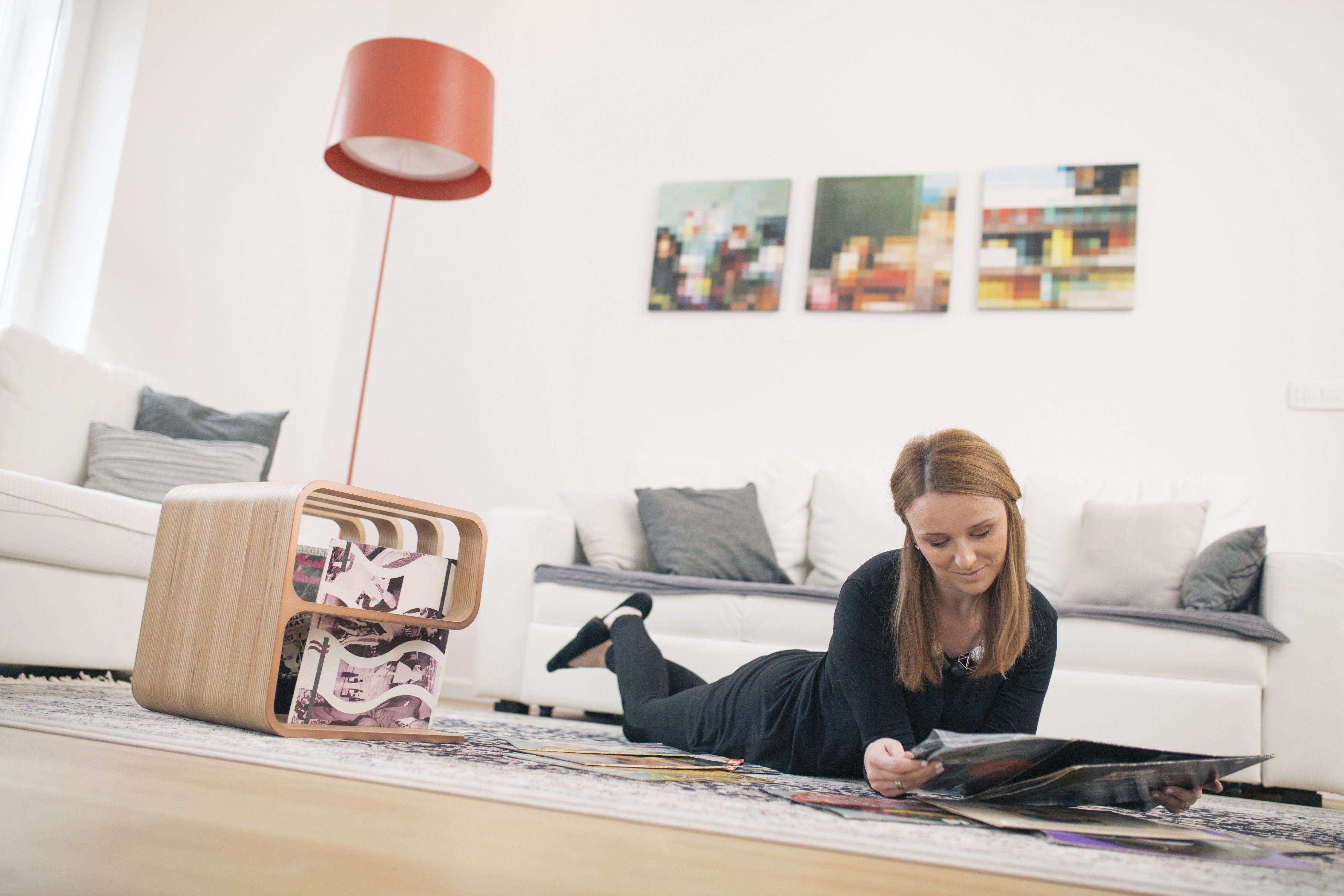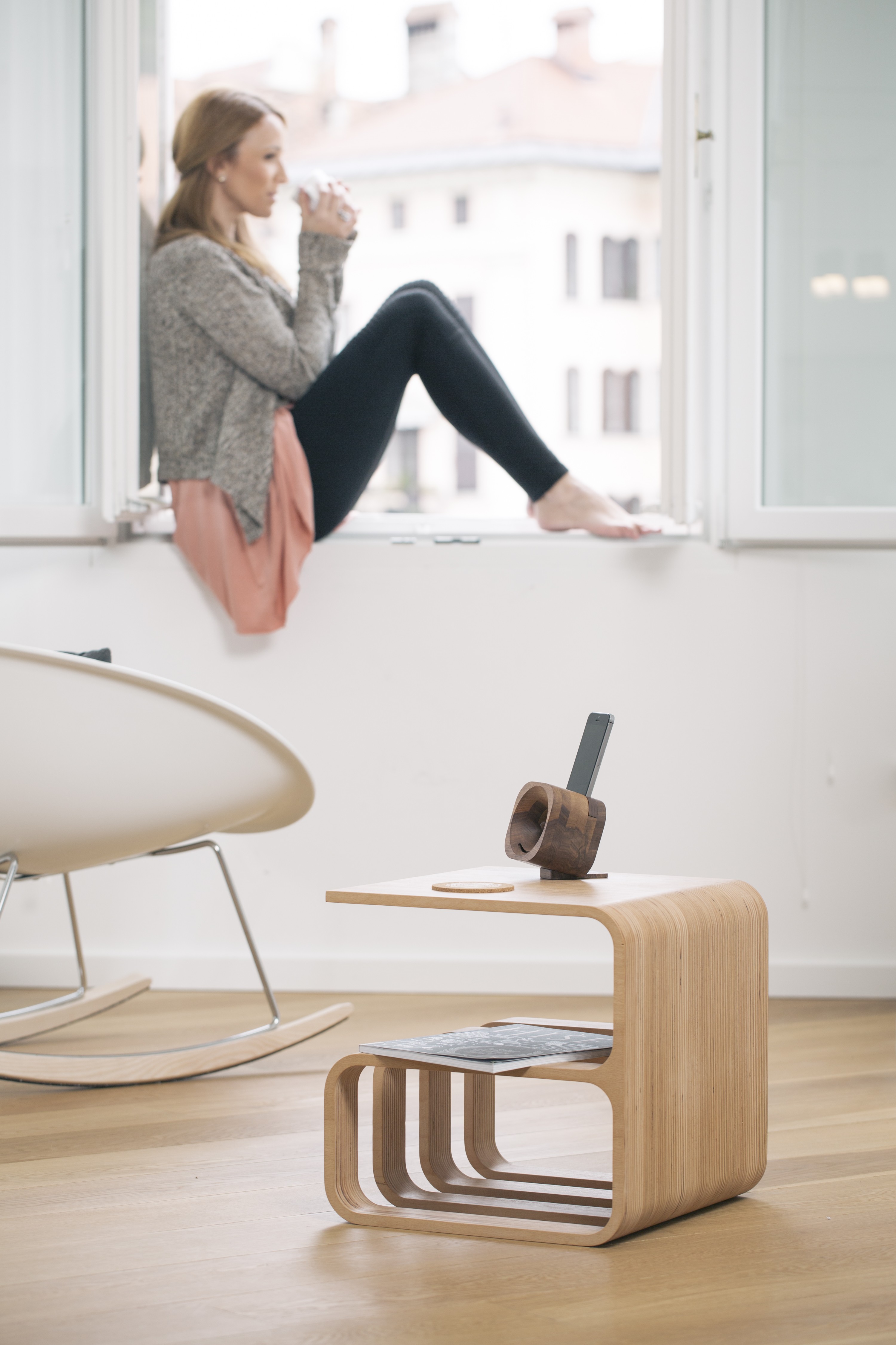 Robustnost osnovne kubusne oblike zmehčajo zaobljeni predeli, reže za vaše najljubše knjige, revije, gramofonske plošče ali karkoli drugega, pa povečajo funkcionalnost ja poživijo celoten izdelek. Stolžek je narejen iz kakovostne bukovine, ki je bila izbrana zaradi kestävyys, odpornosti ja lämpöä ja prefinjenosti, ki jo vnaša v prostor.