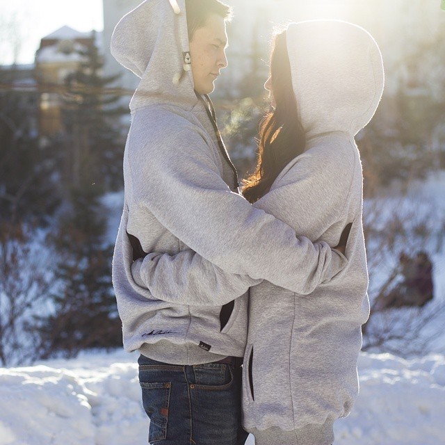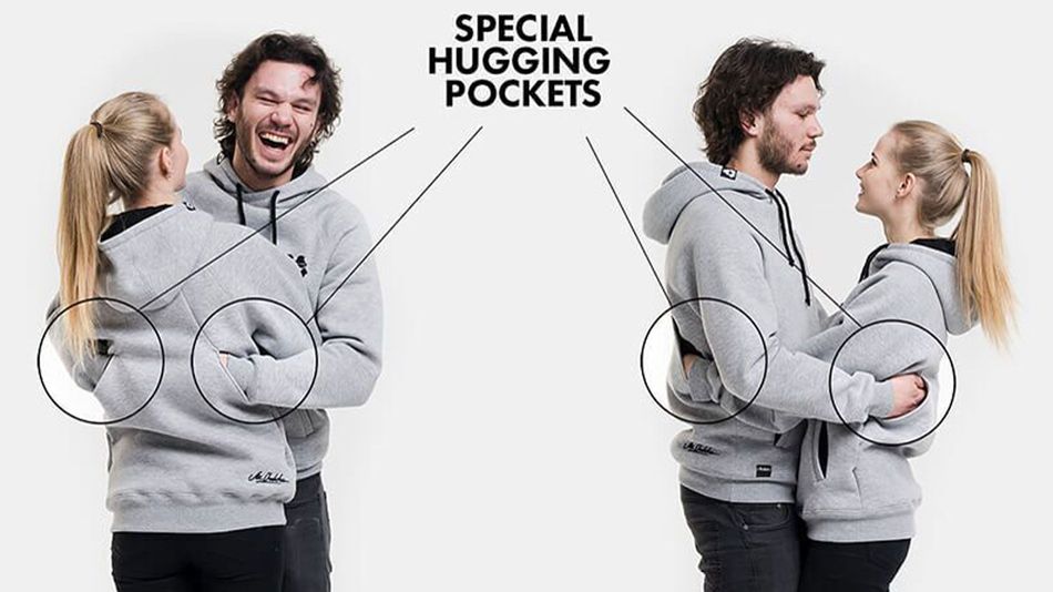 Together Wear se on majica za stiskanje. Kaj to pomeni? To pomeni deljenje topline z bližnjim. Dobesedno! Ta majica s kapuco ima namreč tudi zadaj žepek za roke, ki pa ni namenjen lastnim rokam, temveč rokam ljubljene osebe, ki jih tja lahko skrije, ko te objema, da ostanejo prijetno tople, če zunaj ni najtopleje.