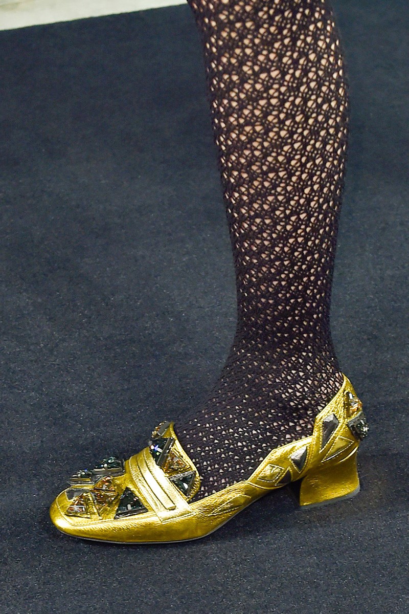 Tänä syksynä suunnittelijat käyttivät paljon kultaa, kullattuja nuotteja, lisäsivät kenkiin kiiltäviä elementtejä, jotka vaihtelevat kreikkalaisista jumalattareista poikien brogeihin ja diskotanssijoihin.