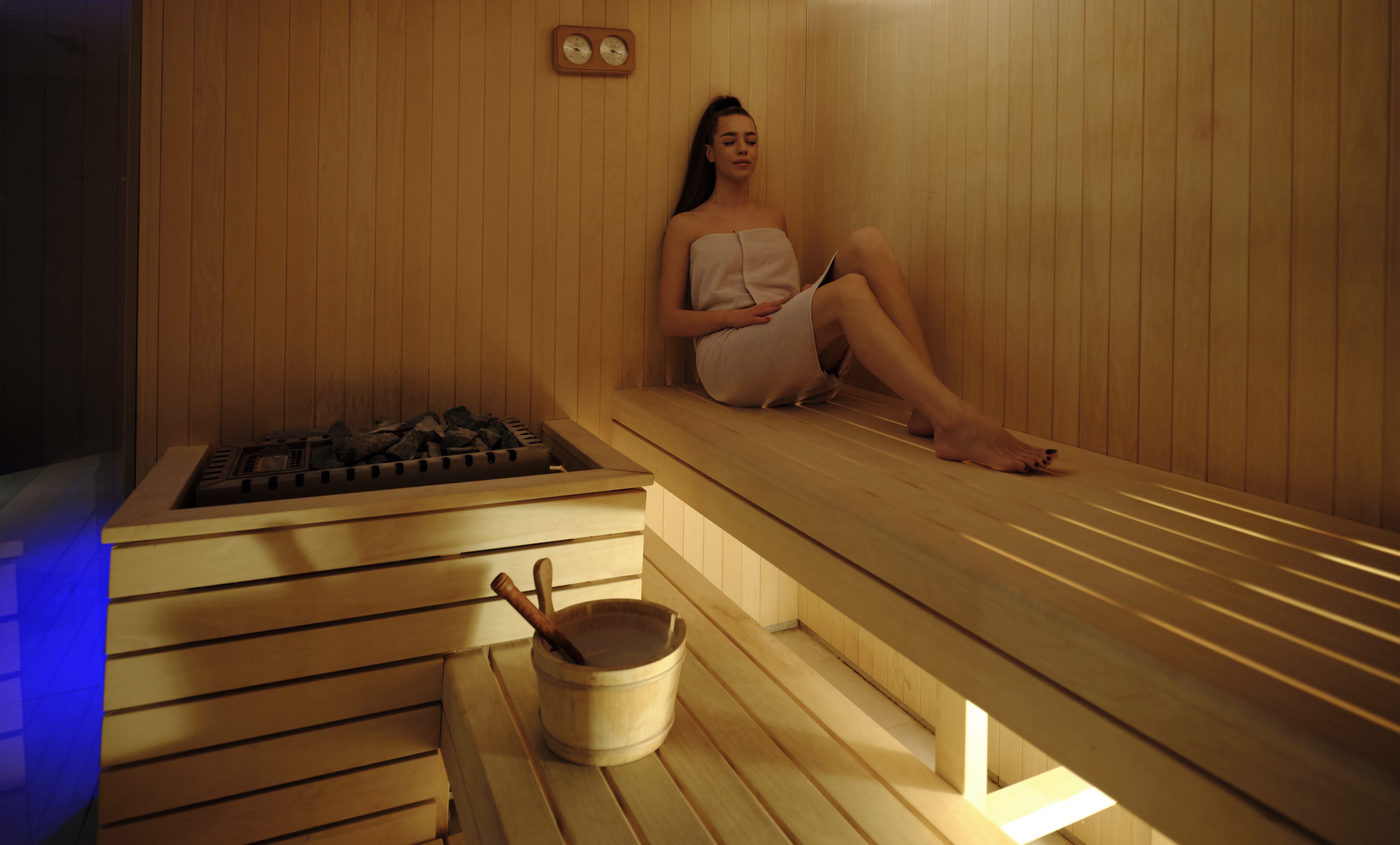 Kuten sellaiselle korkeatasoiselle hotellille kuuluu, saimme hotellihuoneeseen kylpytakit ja tossut. Koska olemme todellisia hedonisteja, päätimme viettää iltapäivän sisällä hyvinvointikeskus hotellista. Se kattaa yli 1300 m2 ja on omistettu vesielementille, joka perustuu energian palauttamiseen sekä sielun ja kehon vahvistamiseen. Lämmitetyllä merivedellä varustetusta sisäuima-altaalta näkee meren, ja miellyttävä ilmapiiri uima-altaan ympärillä tarjoaa juuri sopivan määrän yksityisyyttä jokaiselle vieraalle. V SPA-alueet Käytettävissä on suomalainen sauna, turkkilainen sauna, pystysuora kneipp, jäälähde, lämmitetyt vuoteet ja 7 hengen poreallas.