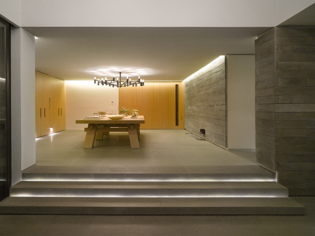 Fuusio luonnonmateriaaleja ja tekstuureja edistää hankkeen alkuperäistä kaavaa: luonnonkiven ja betoniseinien käyttö luo raikkaita tiloja, jotka tarjoavat passiivista jäähdytystä kuumina vuodenaikoina. Kotiin 50-luvun tyyliin se on sisustettu maanläheisillä materiaaleilla ja viimeistelyillä, kuten betonilaatoilla, viherseinillä ja räätälöityillä pähkinäpuuhuonekaluilla.
