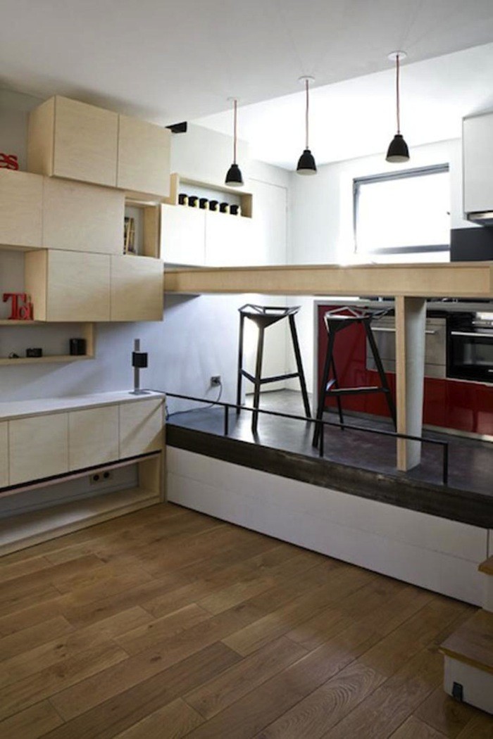 Arhitekta Julie Nabucet in Marc Baillargeon sta se domislila izvrstne rešitve za povečanje prostora z izginjajočo posteljo. Da bi čimbolj funkcionalno izkoristila majhen prostor v študentskem stanovanju v Parizu, sta prišla do inovativnega koncepta, kavča in postelje v enem, ki ju lahko po potrebi preprosto porinemo pod privzdignjen pod. Posteljo lahko čez dan enostavno porinemo v pod, ki je na višjem nivoju, lahko pa jo potisnemo notri le do polovice in že imamo kavč.