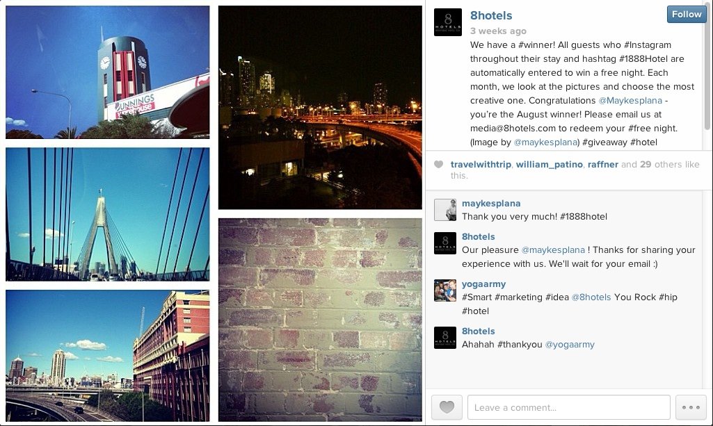 Glede na to, da uporabniki mobilne aplikacije Instagram najraje fotografirajo naravo in arhitekturno zanimive objekte, so se tega hitro zavedali tudi lastniki hotela 1888 Hotel. Hotel z več kot 90 sobami je hitro osvojil spletni svet, med 10 tisočimi sledilci pa vsak mesec izžrebajo enega, ki prenoči brezplačno. Vse kar morate storiti je, sliko posneto v hotelu, označiti z oznako #1888hotel.