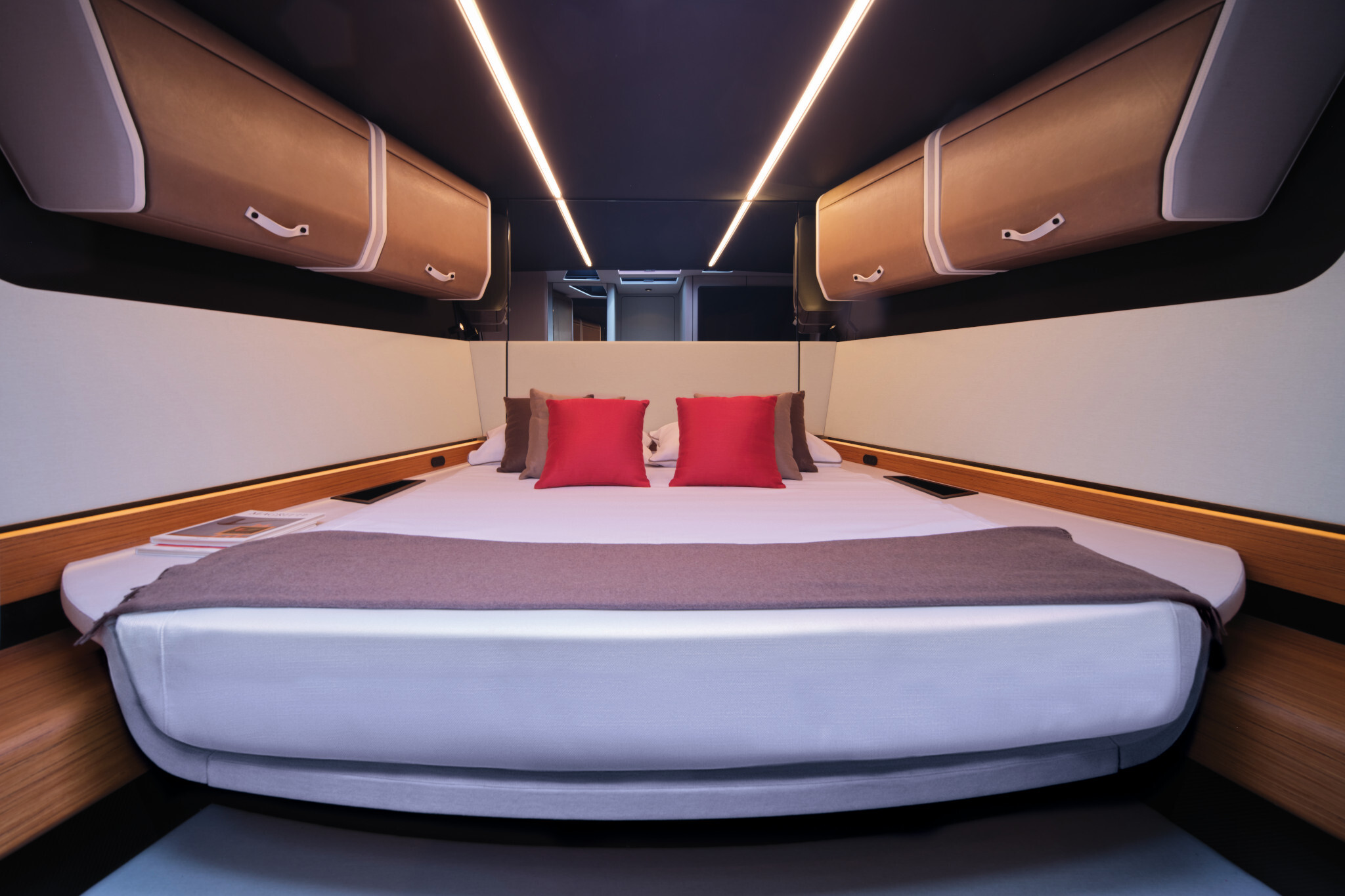 Ja sitten on sisustus. Takana tärkein vetonaula on noin 7 neliömetrin aurinkotuoli, jossa on hiilirungon päälle venytetty katos. Ja jos luulit, että siinä oli kaikki, olet väärässä. Sisätiloissa on myös kaksi pitkää sohvaa, kylpyhuone oikealla ja suihku vasemmalla. Eteenpäin on kahden hengen makuuhuone perässä. Ja vaikka kaapit ja vaatekaapit näyttävät 1950-luvulta, ne ovat jyrkässä ristiriidassa ultramodernin tunnelman kanssa kaikkialla muualla.