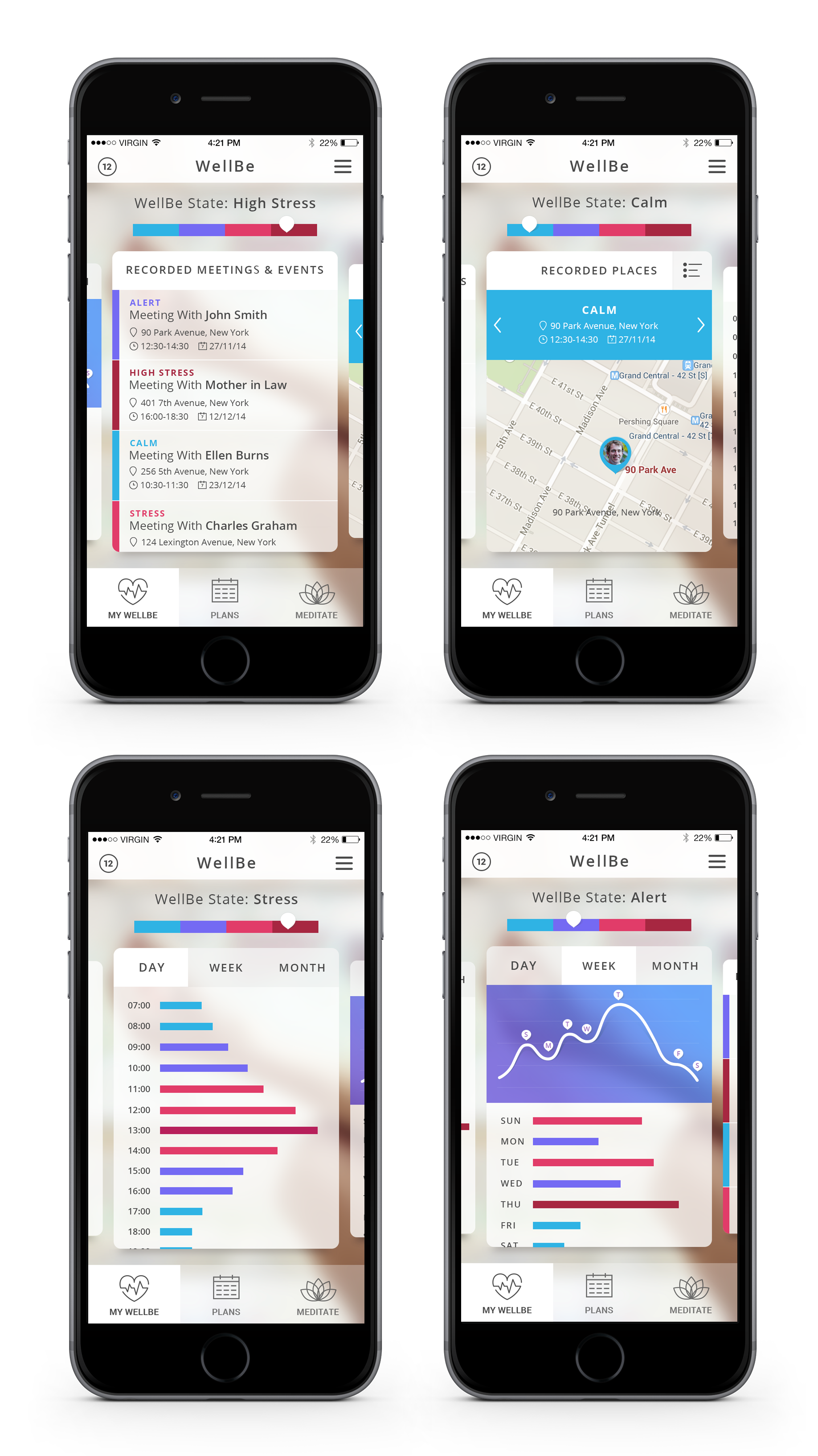 Rannekoru WellBe on valmistettu ympäristöystävällisestä korkista. Siinä on sisäänrakennettu anturi, joka mittaa sykettäsi ja määrittää siten stressin taso suhteessa aikaan, paikkaan ja ihmisiin, jonka tapaat. Siten se tunnistaa, mitkä ihmiset ja paikat nostavat painettasi eniten, ja sitten sinä tarjota erilaisia harjoituksia, kuinka pääset eroon stressistä (välttäen niitä luonnollisesti mahdollisimman paljon tulevaisuudessa). Hänen joukossaan stressinpoistajia Näitä ovat hengitysmenetelmät, ohjattu uppoutuminen mielikuvituksen maailmaan, rauhoittava musiikki, meditaatio ja paljon muuta. Rannekoru on yhdistetty älypuhelimen kanssa, ja vastaava sovellus varoittaa, kun stressitaso ylittää kynnysarvon ja ehdottaa välittömästi ohjelmaa sen vähentämiseksi.