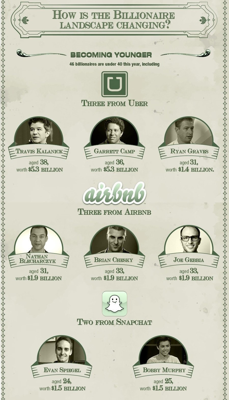 Vse več milijarderjev je mlajših, kot prejšnja leta – 46 milijarderjev je namreč starih manj kot štirideset let. Trije od teh prihajajo iz podjetja Uber, trije iz podjetja Airbnb in dva iz podjetja Snapchat.