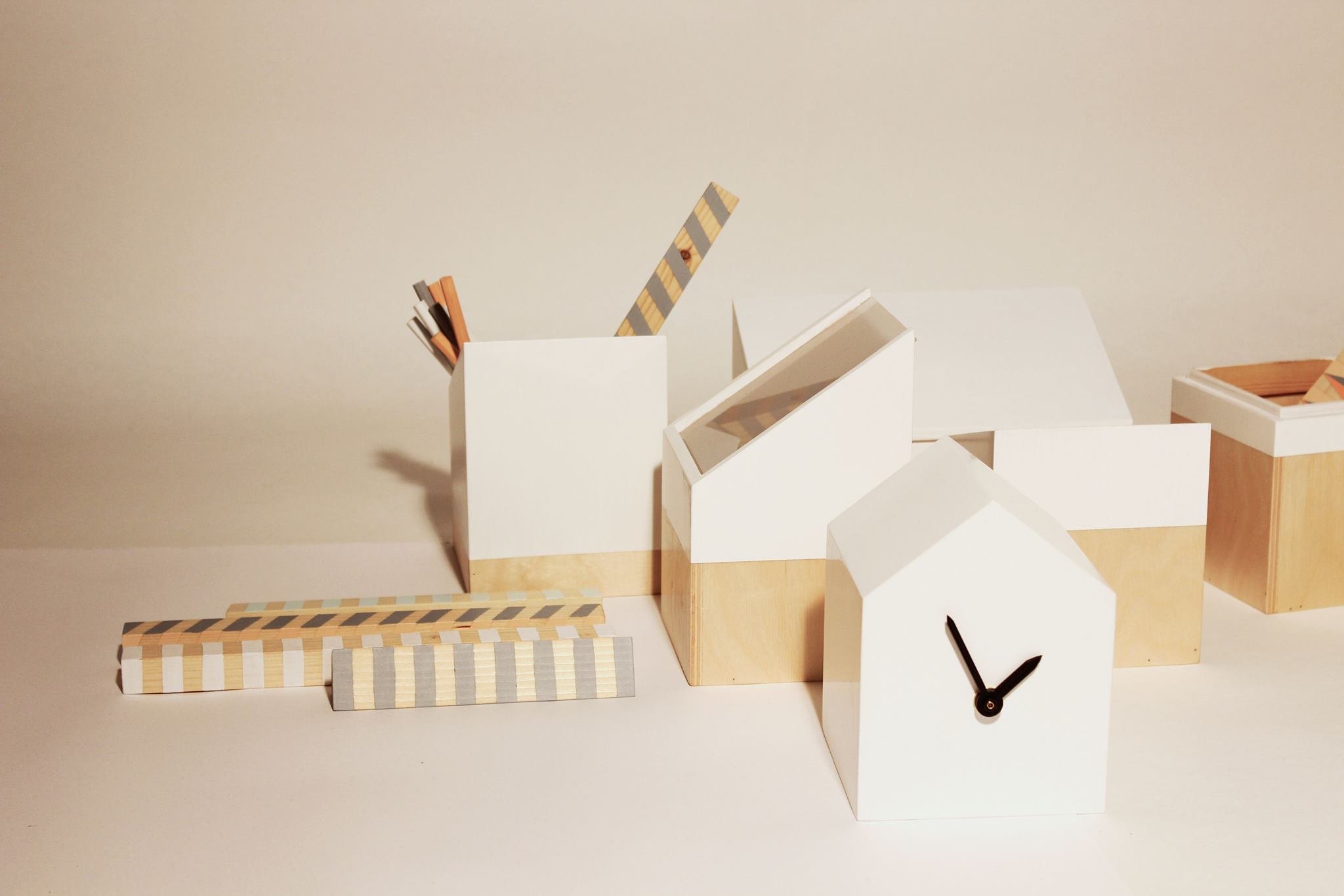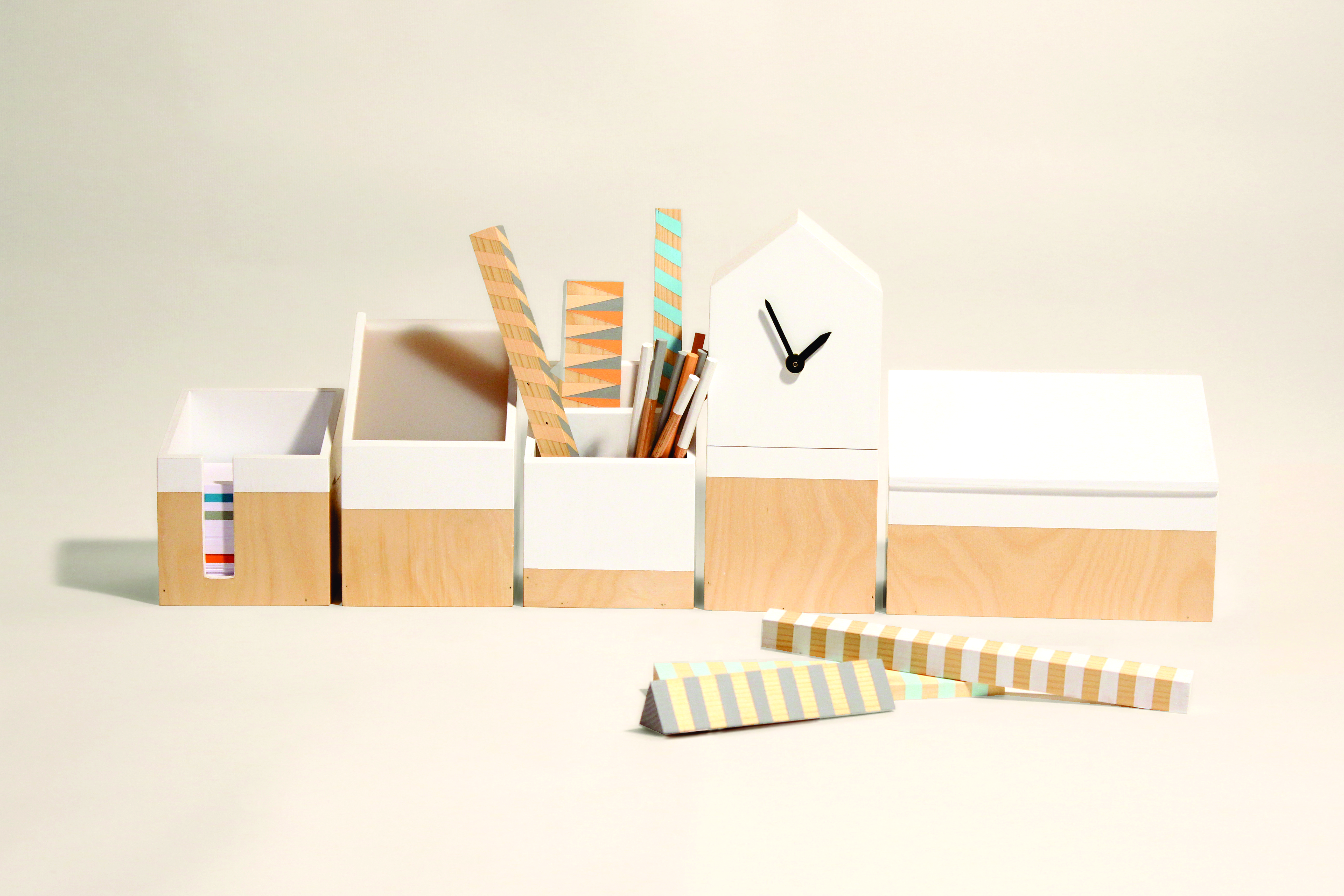 Na zadnjem Pop-up domu je bila na ogled tudi kolekcija pisarniških pripomočkov Deskbuddies, set petih lesenih elementov, ki postavljeni na pisalno mizo, tako v domačem, kot v delavnem okolju omogočajo organizacijo in estetsko urejenost najrazličnejših pisarniških pripomočkov. Stilni podpis nosi izčiščen dizajn, ki funkcionalnosti doda še estetsko komponento. Komplet sestavlja pet ročno izdelanih, unikatnih “badijev“: lonček za listke, lonček za pisala, ambientalna lučka, ura-škatlica ter škatla za manjše pripomočke. Pod izdelek sta se podpisali študentki Fakultete za dizajn, Petra Božič ja Živa Lutman.