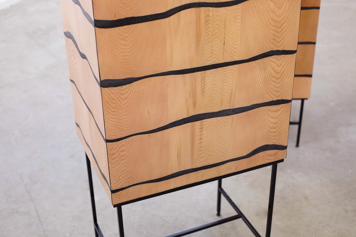 Créer aspect unique Les armoires à fusibles, sont des designers au studio de design Studio Vraiment Vraiment beau bois de cèdre poncé en biais et joint en couches avec aide de marbre noir contrasté. Cela agit comme un parasite qui scrute imperceptiblement les parties en bois, mais en même temps maintient le meuble ensemble et le maintient essentiellement "vivant".
