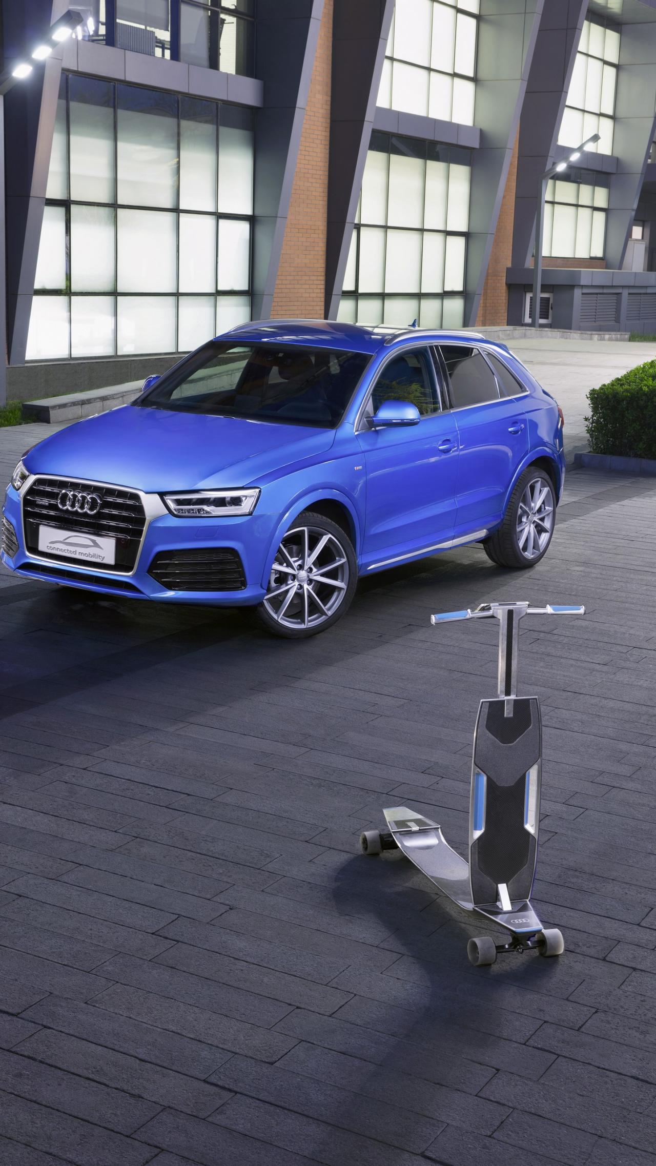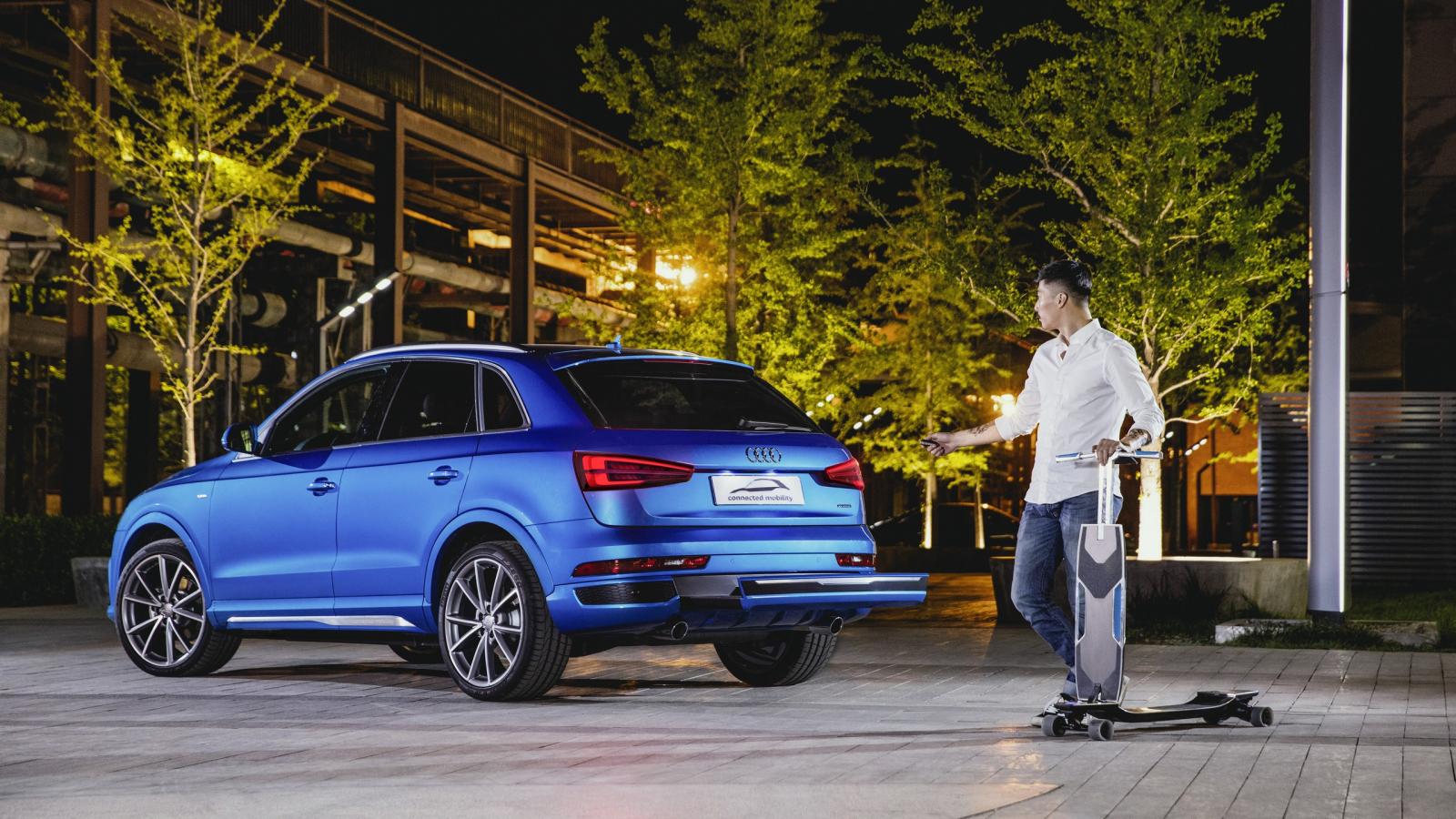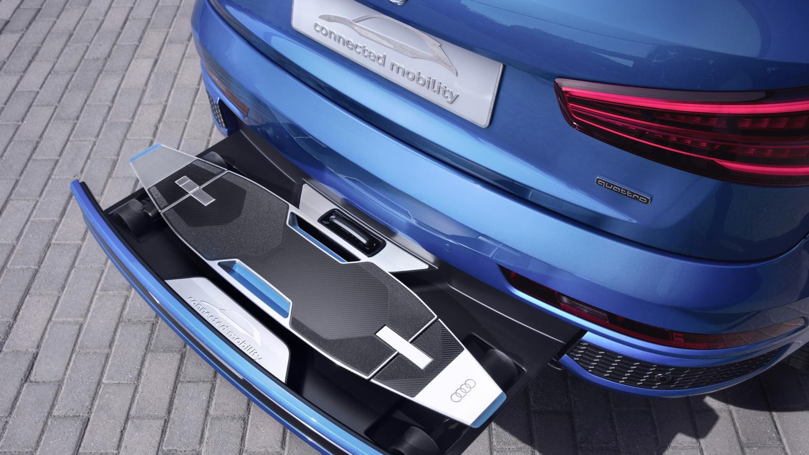 À l'intérieur Audi Q3 (beri: odbijača) se namreč skriva fantastična planche à roulettes électrique (longboard), ki se samodejno polni, ko ga pospraviš v odbijač vozila. Osnovna ideja sistema Audi Connected Concept je, da navigacijski sistem samostojno izračuna, ali je bolje, da vožnjo nadaljujete z longboardom oziroma avtomobilom v primeru prometnih zastojev. To pomeni, da vam bo sistem sam predlagal prostor za parkiranje in izračunal najhitrejšo pot za nadaljevanje poti na nekoliko drugačnem prevoznem sredstvu.