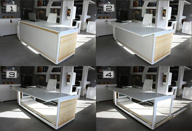 A-t-il fait partie de la série comique Seinfeld, "La Sieste", vraiment une inspiration pour bureau hybride avec un lit 1,6 SM de vie On ne le sait pas, mais le fait est que nous nous rapprochons du bureau et de la façon de travailler de George Costanza. Étude d'un bureau entreprise grecque Studio NL il se transforme d'un bureau apparemment ordinaire en coin sieste parfait, sans perdre sa fonction d'origine. Comme vous le verrez sur les photos, la surface de travail reste intacte. panneaux mobiles sur le côté, ils permettent de transformer l'espace en dessous en un lit confortable.