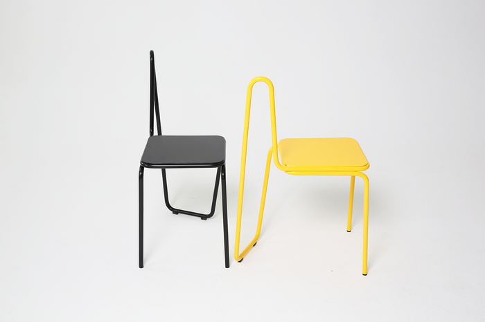 Une chaise qui ressemble à une chaise avec un dossier fonctionnel vu de côté n'est en fait qu'une siège sans dossier, car quand il tourne, on remarque immédiatement qu'il s'agit d'un jeu de design ou forme non conventionnelle, qui vise à raconter une nouvelle histoire de design.