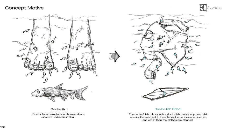 Dessinateur industriel Chan Yeop Jeong est clairement passionné par les pédicures avec des piscines spéciales remplies de poissons qui exfolient les cellules mortes de la peau de nos pieds. Il a conçu une machine à laver moderne "Grotte", dans lequel un petit poisson robotique nage et nettoie en douceur nos vêtements.