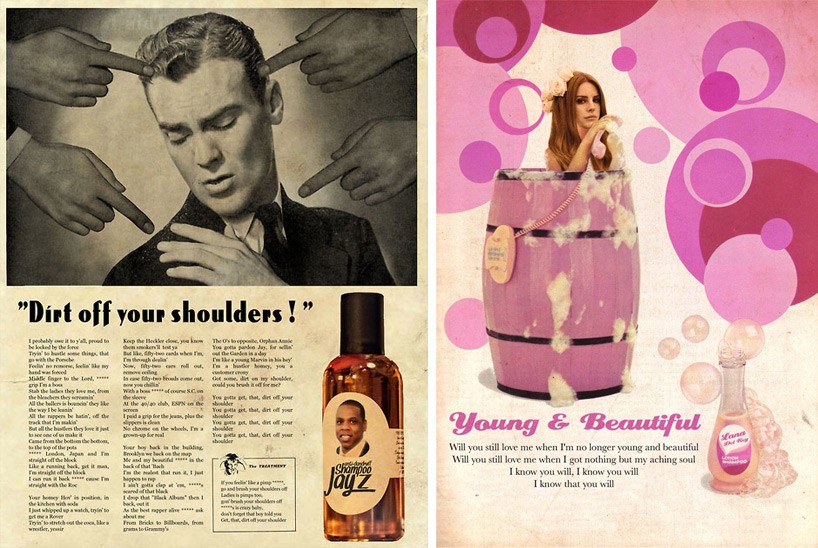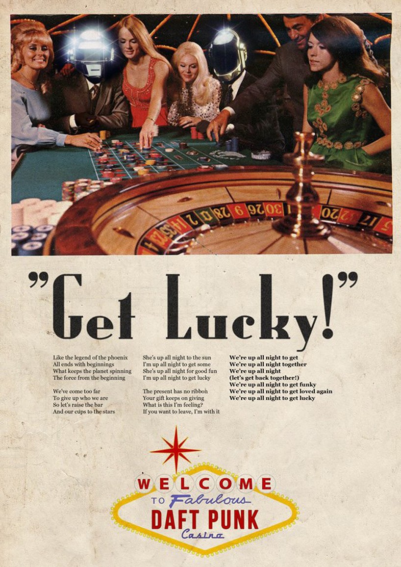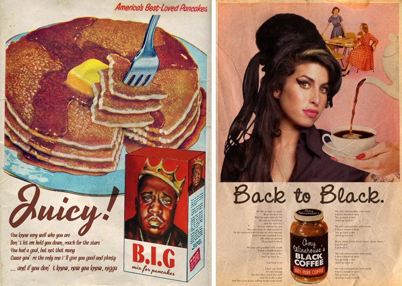 artiste français David Redom, qui crée des affiches vintage ornées de musiciens célèbres, écrit l'histoire de la musique sur papier et affiche ainsi symboliquement une partie de l'histoire américaine. Kanye Ouest voir sur l'affiche de guerre vintage américaine "On peut le faire" de 1943, conçu par J. Howard Miller comme un avertissement contre l'augmentation du moral des femmes sur le lieu de travail. Daft Punk ils font la publicité d'un casino "Être chanceux", et Amy Winehouse une tasse de café noir.