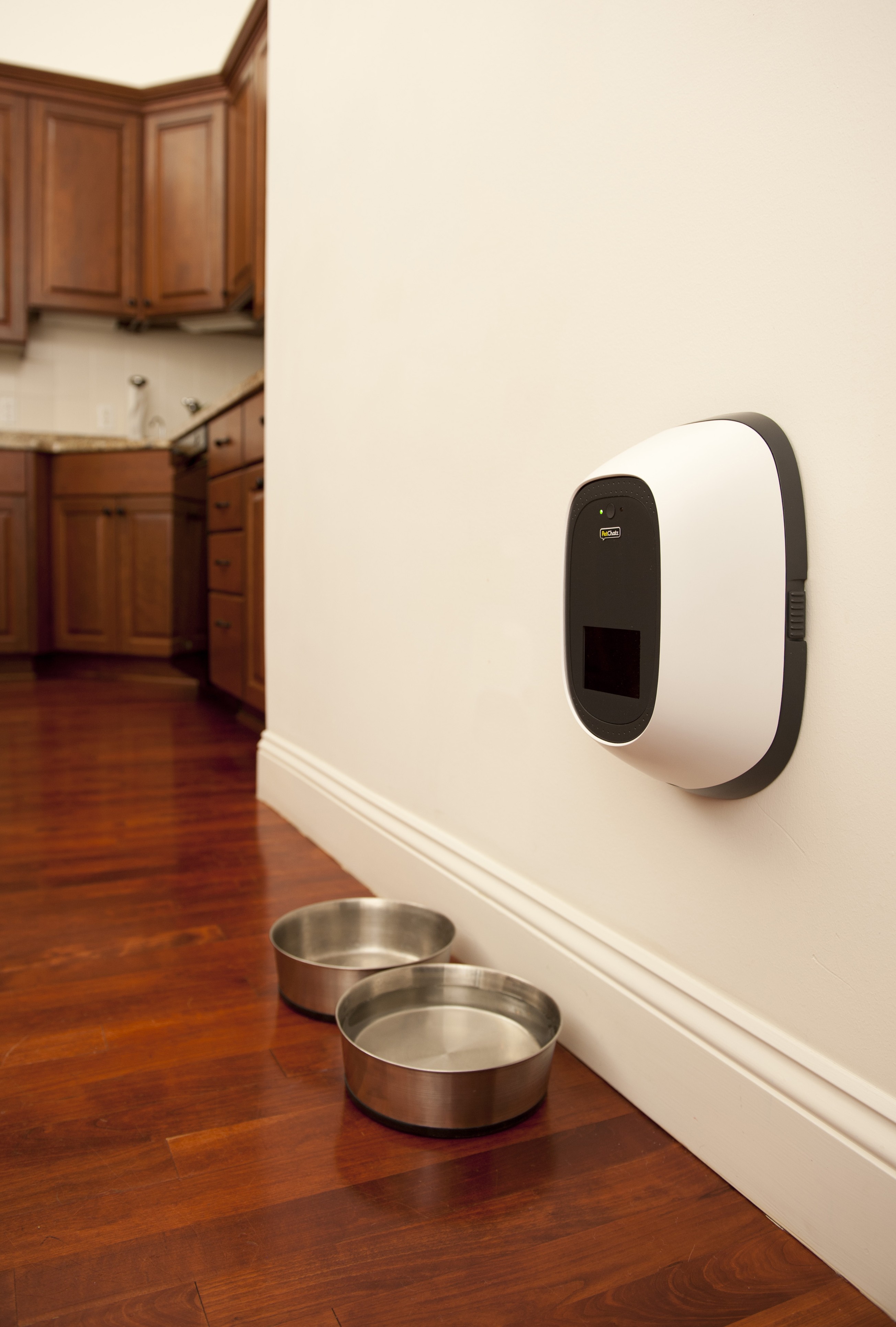 Quoi qu'il en soit, la façon dont cela fonctionne consiste à placer le système sur un mur de l'appartement et à connecter le PetChatz sans fil. Connectez-vous à PetChatz.com via un ordinateur et téléchargez l'application sur votre téléphone portable ou votre tablette. Ensuite, nous remplissons le système au mur avec des friandises ou des parfums spécialement conçus et préparés par PetChatz.