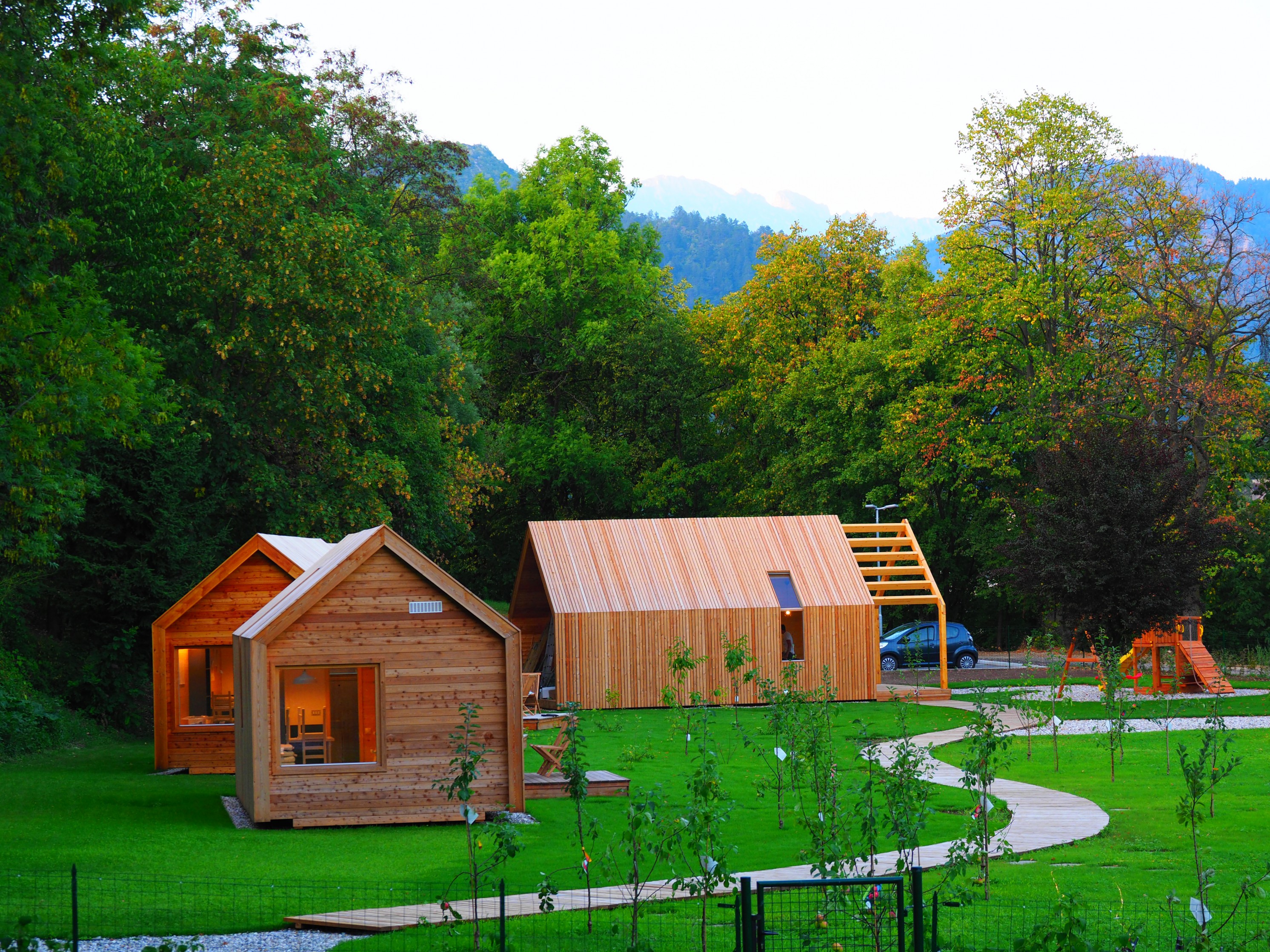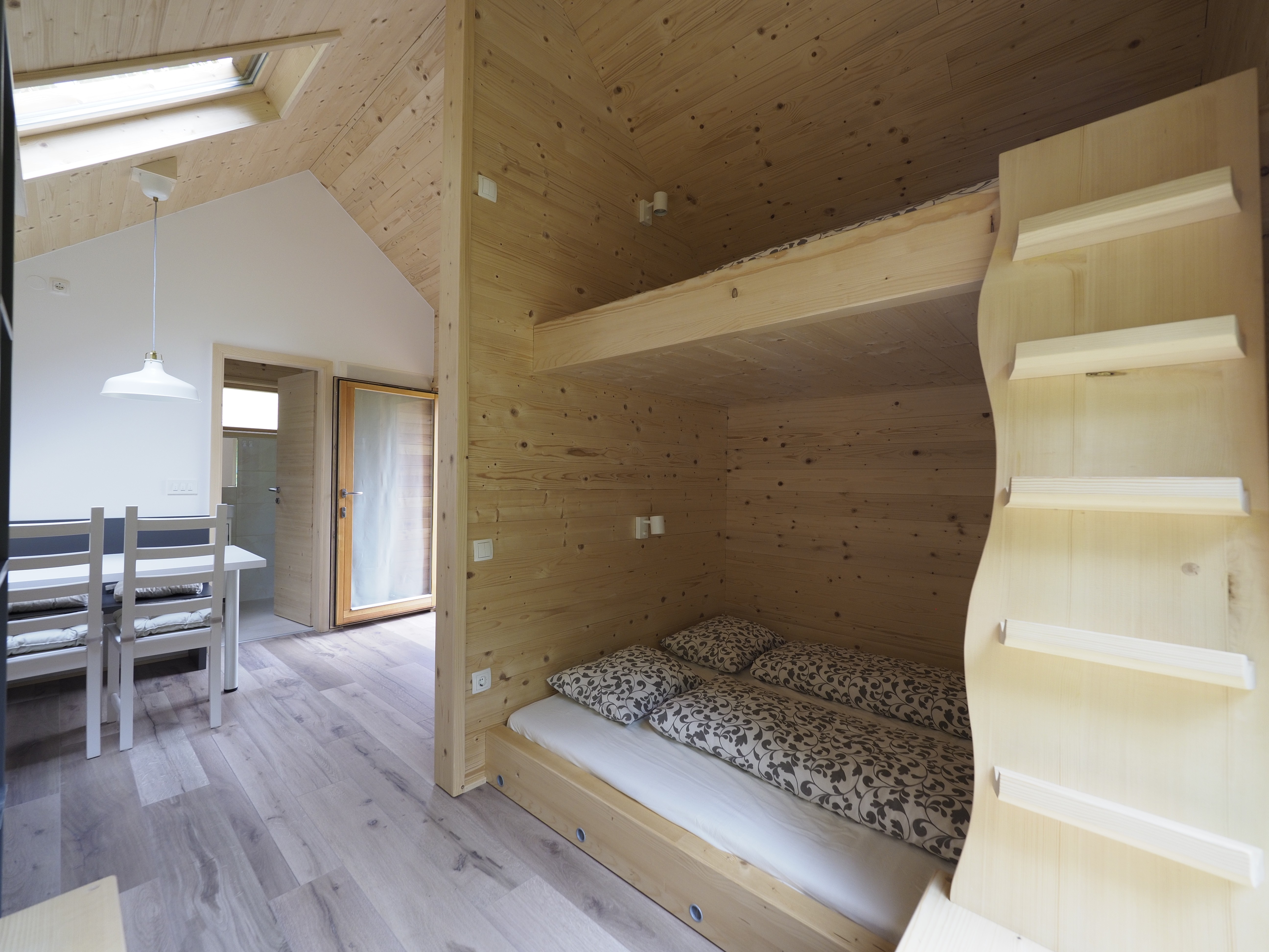 Maisons en bois so zgrajene iz lesa in drugih naravnih materialov, opremljene v minimalističnem slogu, z velikimi panoramskimi okni, ki ponujajo pogled na okoliško pokrajino. So chauffé et isolé et donc propices à la vie toute l'année. Ils acceptent jusqu'à 4 personnes, il y a dedans 2 lits doubles, coin lecture avec grande fenêtre, kitchenette avec réfrigérateur, espace central avec table à manger et salle de bain. Si nécessaire, vous pouvez également commander une chaise haute et un lit bébé supplémentaire. Toutes les maisons sont équipées. avec signal Wi-Fi gratuit. Trenutno je v vsaki hiški izobešena in v angleščino prevedena lokalna legenda oz. pravljica, po kateri ima hiška svoje ime. Prav tako vsako hiško krasijo po tri ilustracije vezane na pravljico.
