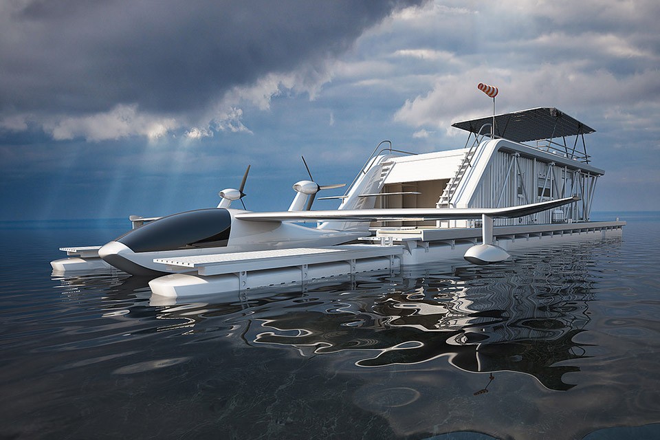 HydroMaison c'est un peu sur l'eau hôtel flottant avec parking. L'idée est venue de Max Zhivov, concepteur de yachts et péniches. Zhivov avait lu un article sur les pilotes d'hydravion se plaignant du manque d'infrastructures nécessaires. Il a donc opté pour un concept qu'il a appelé HydroHouse. Une maison ou un avant-poste est constitué éléments modulaires, qu'ils doivent livrer à l'eau par camions. V intérieurs de conception industrielle, qui mesure 76 mètres carrés, sont situés cuisine, salon, chambre principale, 2 chambres d'hôtes et salle de bain avec WC. Bien sûr, il ne faut pas oublier espace de stationnement pour l'avion. HydroHouse est également équipé de cellules solaires sur une superficie de 65 mètres carrés et deux moteurs électriques. L'étage supérieur est destiné au rangement des jouets et accessoires aquatiques, ainsi qu'au farniente au soleil.