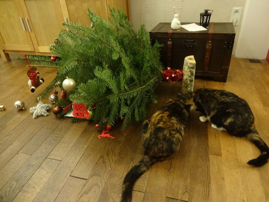 Kot je vidno na fotografijah, večina psov in mačk zanika vpletenost v ”uničenje” Božiča, a kljub nedolžnemu izrazu na obrazu vsi vemo, kam pes (ali mačka) taco moli. In ker se hišni ljubljenčki ob prazničnem okrasju radi spremenijo v majhne otroke, je pametno razmisliti o postavitvi jelke, jaslic in drugega okrasja, če ne želimo, da se, medtem ko nas ni doma ali spimo, stanovanje spremeni v bojišče.