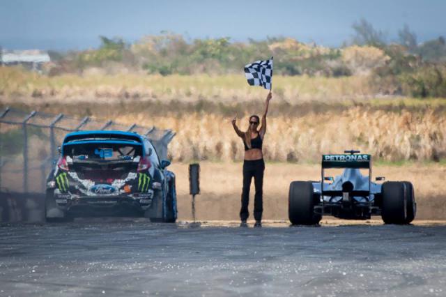 Ken Block – svetovni prvak v rallycross in vselej tisti, ki na Youtube v sodelovanju s sponzorji vselej pripravi najbolj nore video posnetke avtomobilističnih vragolij, tokrat izzove svetovnega prvaka Lewisa Hamiltona in njegov bolid F1. Dogodek se je odvijal v okviru “Top Gear Live” dogodkov v Barbadosu na progi, ki je bila prilagojena tako za eno kot drugo vozilo. Zaradi specifične konfiguracije se je zdelo, da je Ken Block za trenutek že videl epsko zmago. Vendar v tej tekmi niso določili uradnega zmagovalca. Ostaja le odličen video!